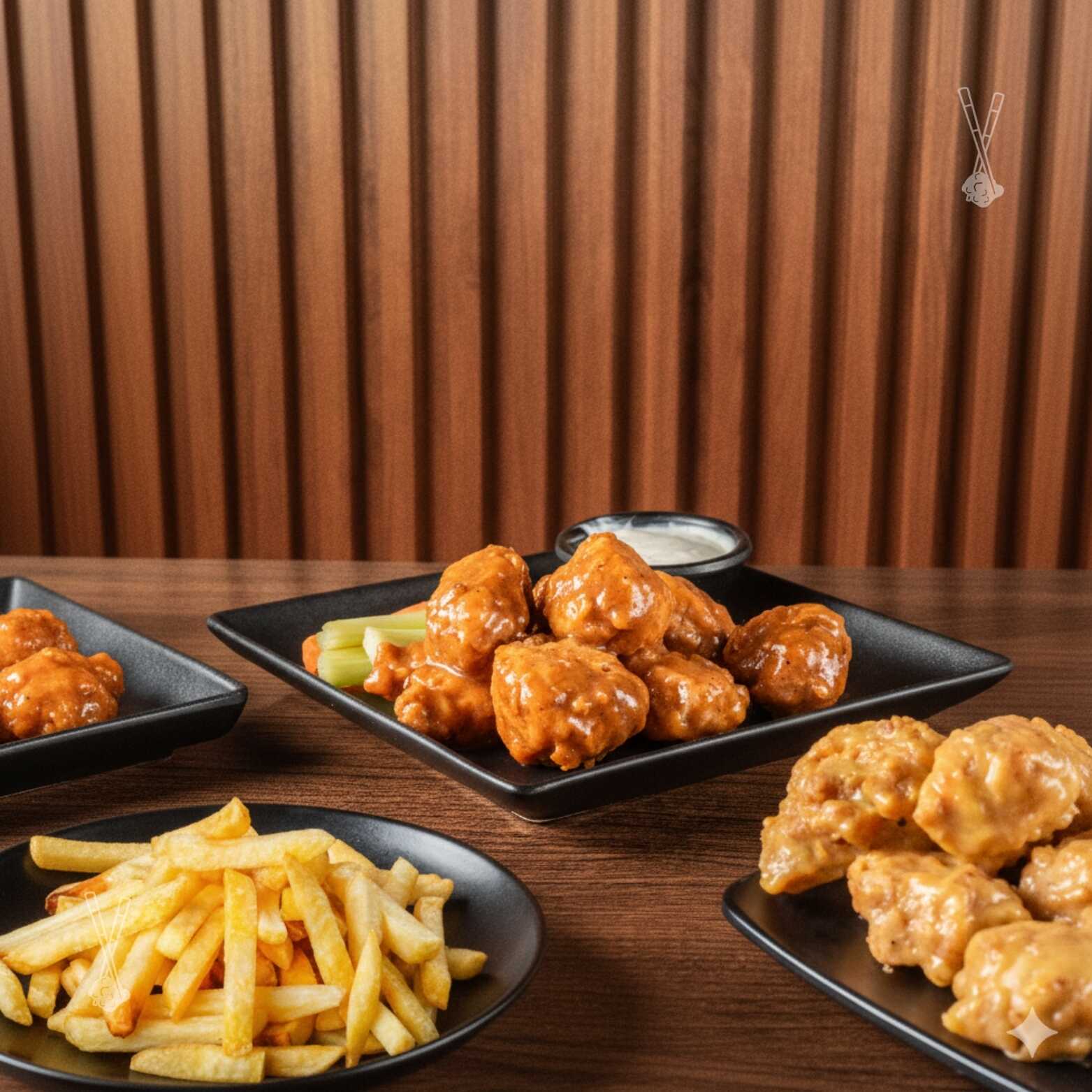 1 Kg. de Boneless, 1 Orden de Complementos, 4 Salsas a Elegir y 4 Aderezos.