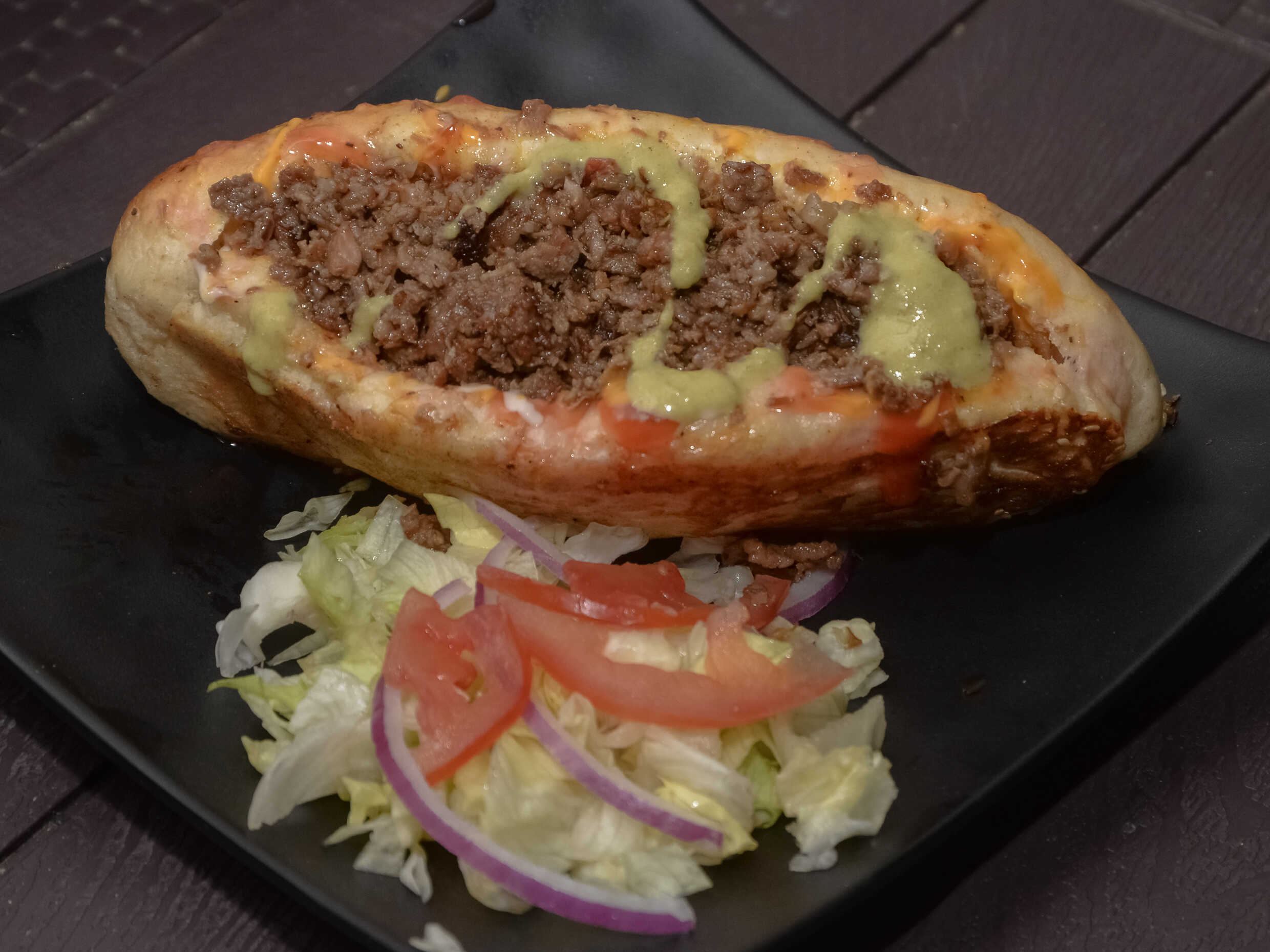 Pan con mantequilla, carne, queso amarillo liquido, lechuga, tomate, cebolla morada, Chile, catsup, mayonesa, mostaza, jamón y tocino, con la especialidad de queso Chihuahua y pepperonis.