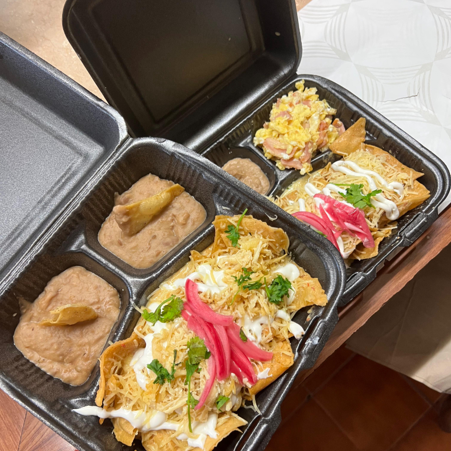Chilaquiles acompañados de tu salsa de preferencia + queso tipo chihuahua + crema. Acompañado de frijoles refritos