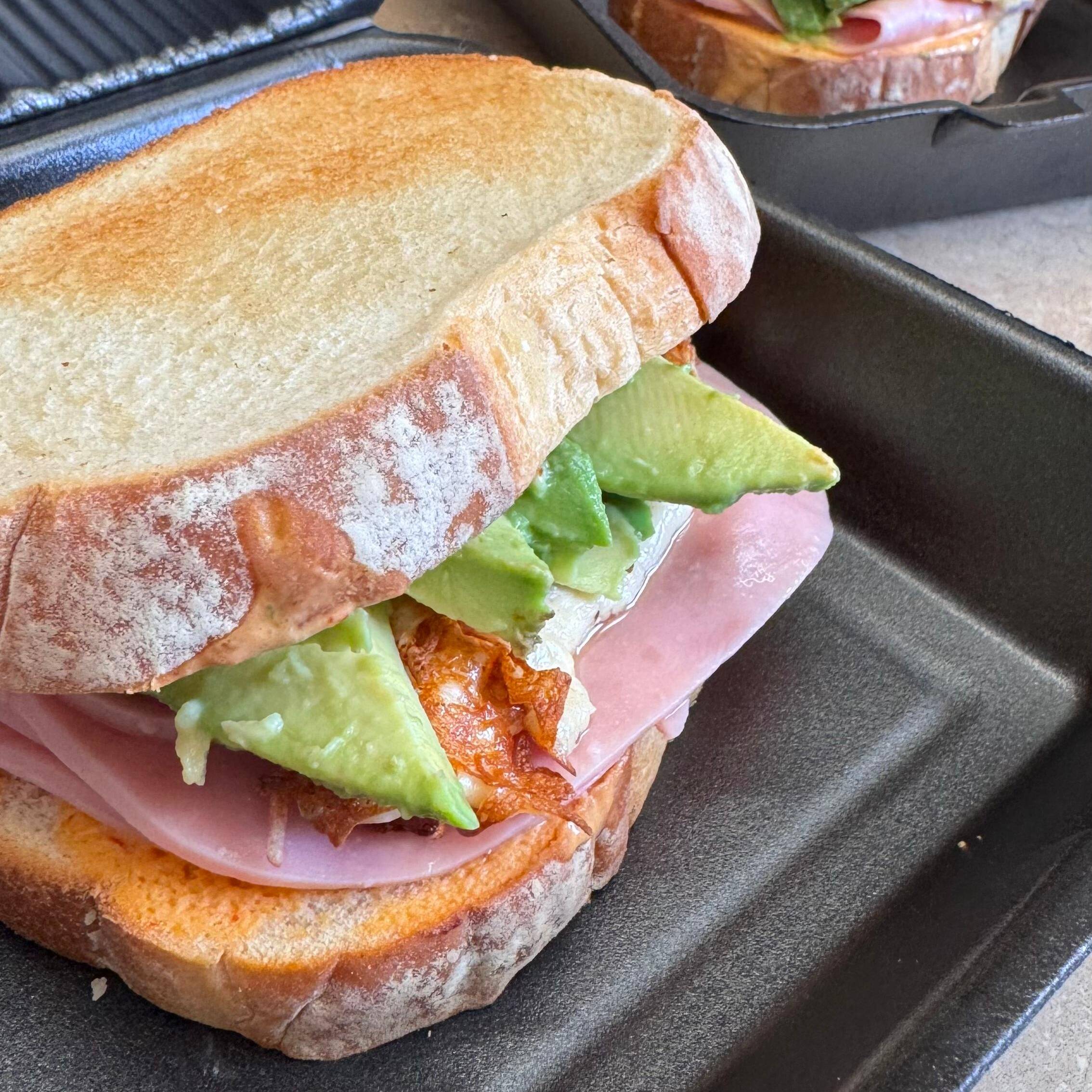 Jamón de Pavo, Costra de queso, aguacate, tocino + Aderezo chipotle