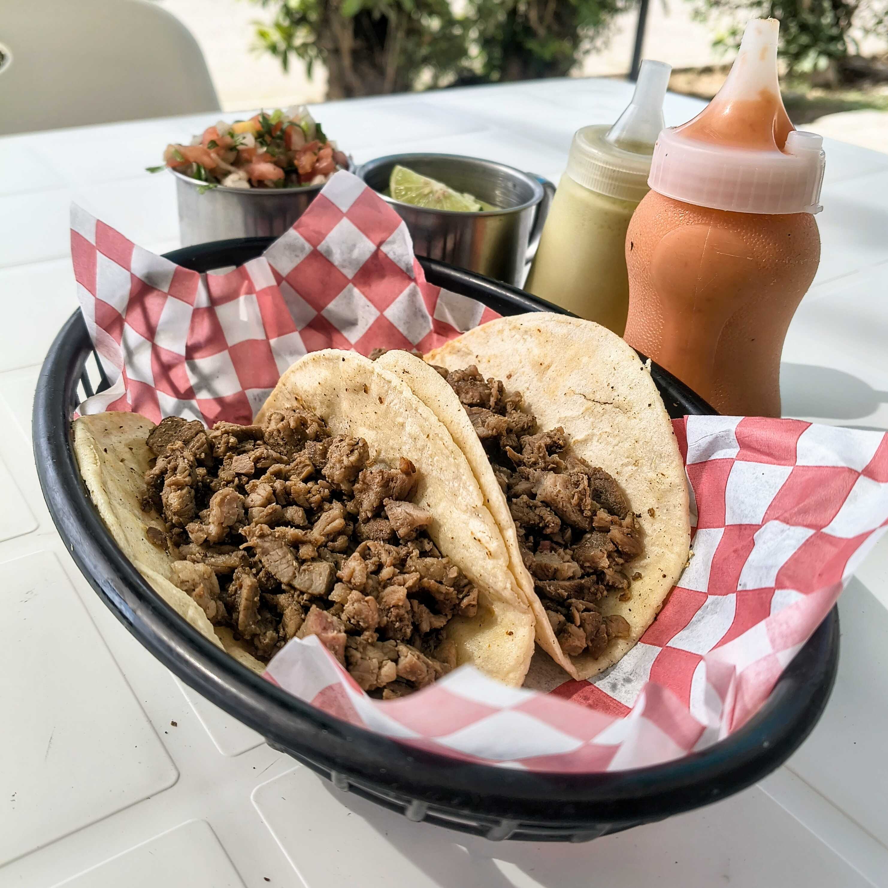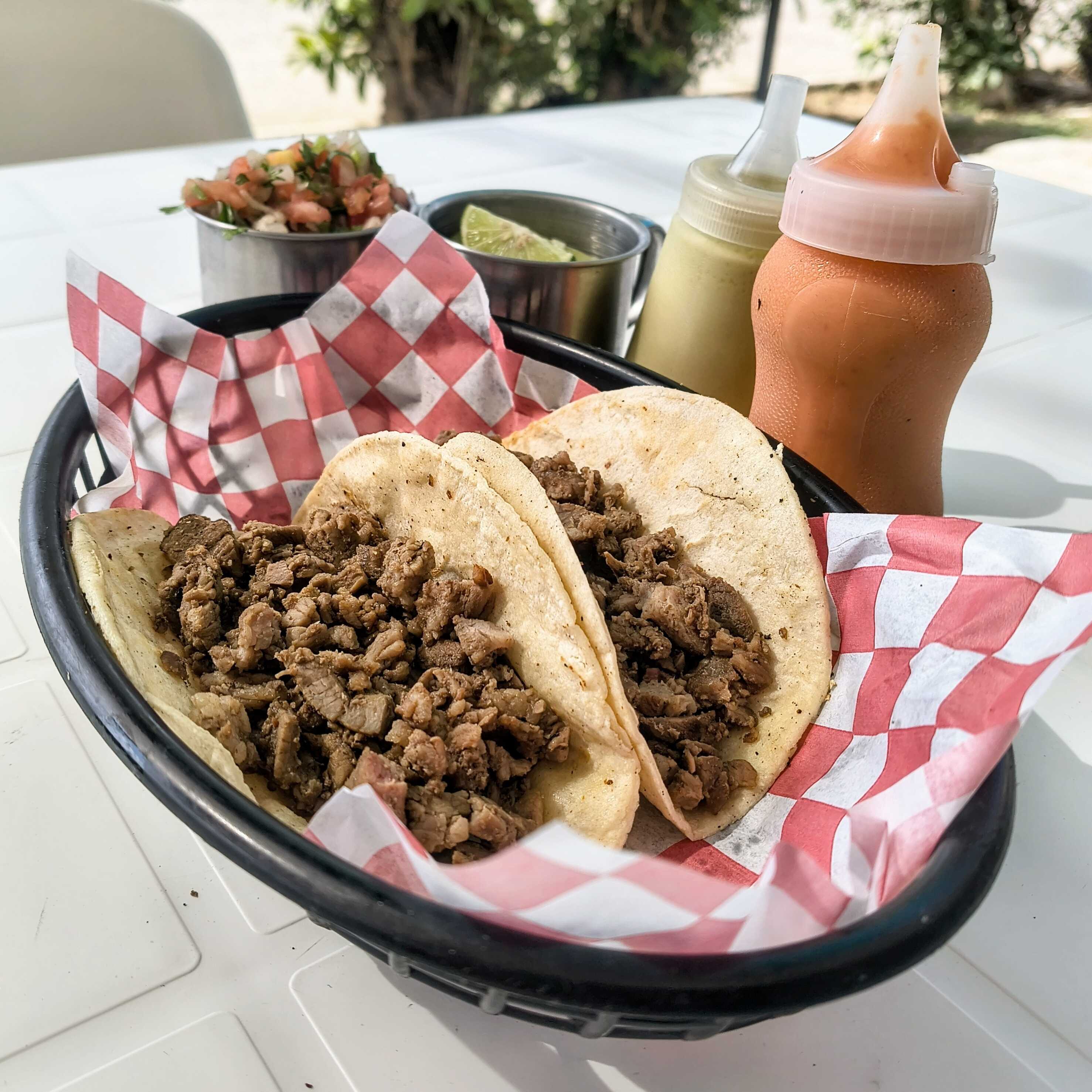 Orden de 4 tacos: 2 de carne asada y 2 de chorizo argentino en tortilla de maiz. Acompañados de pico de gallo, limón y 2 salsas de la casa.