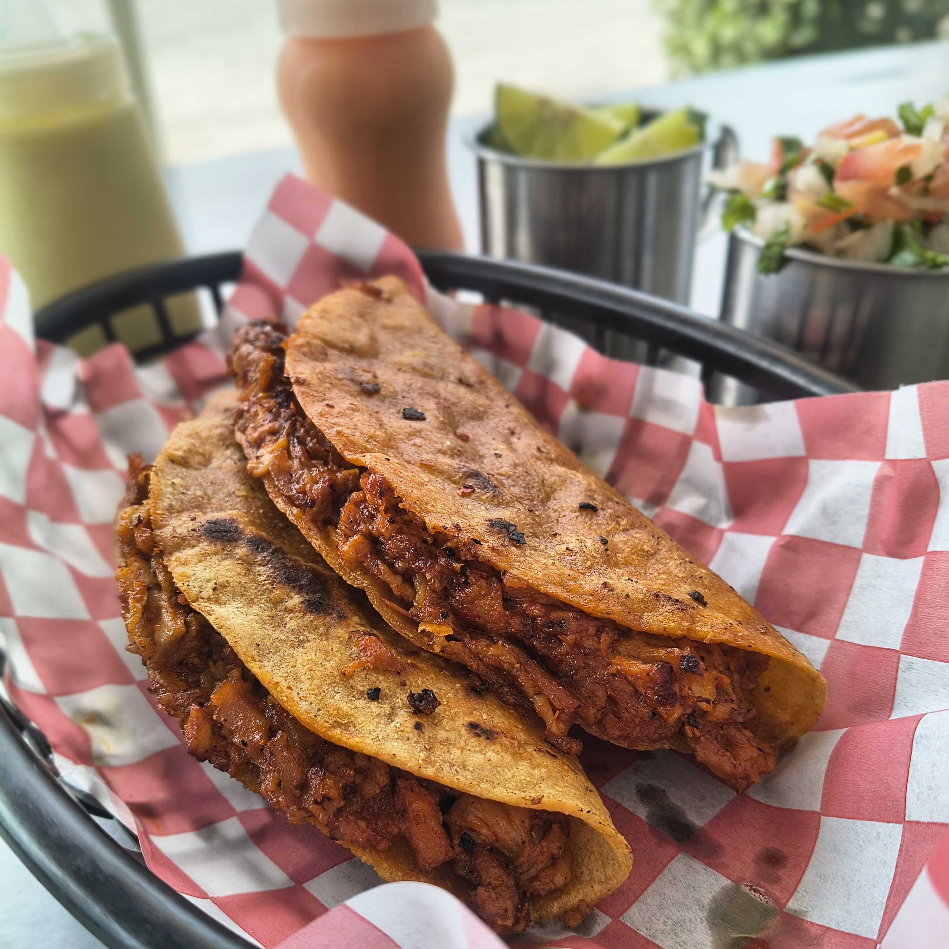 Orden de 4 tacos: 2 de chicharron prensado y 2 de carne asada en tortilla de maíz. Acompañados de pico de gallo, limones y 2 salsas de la casa