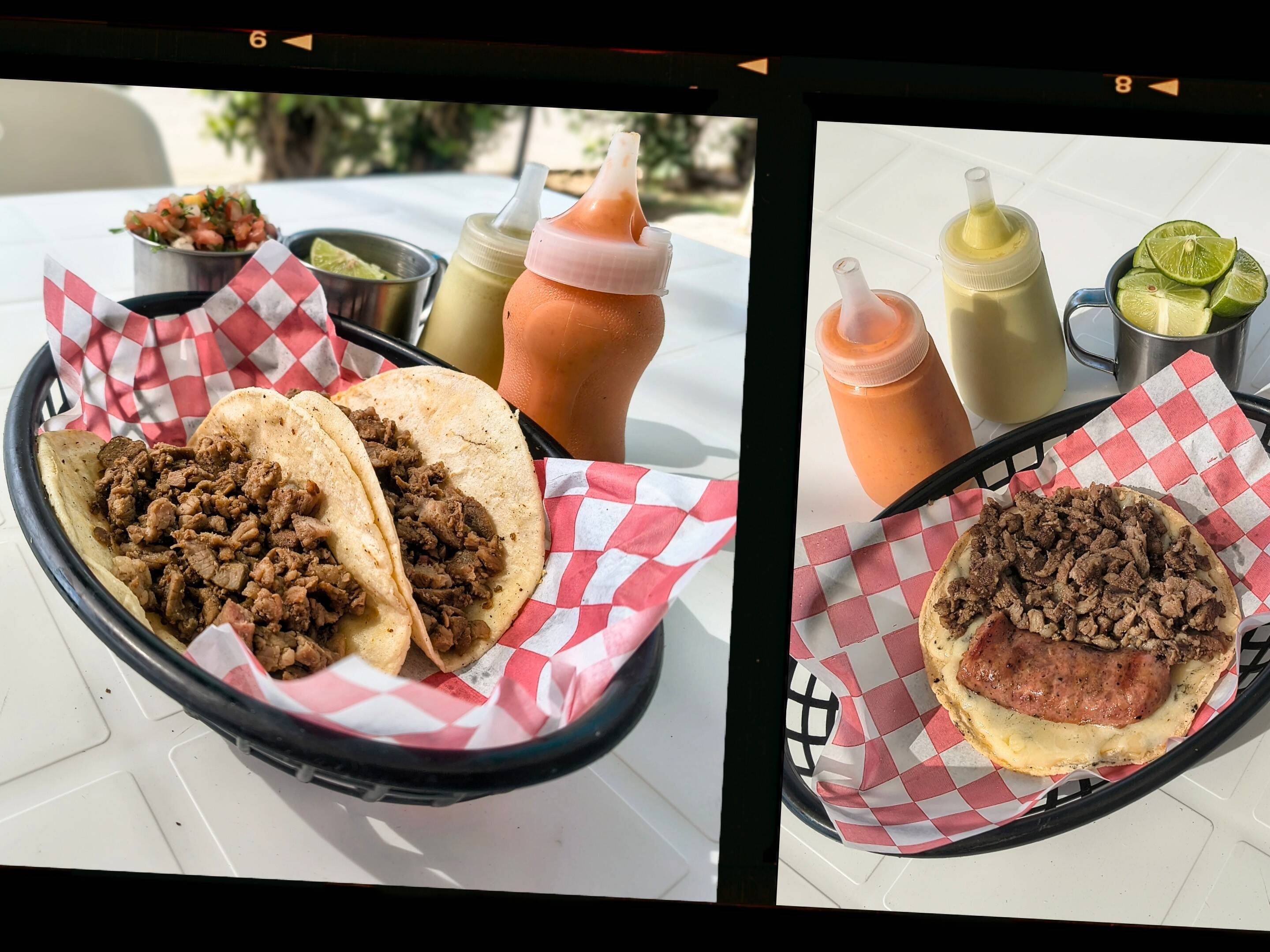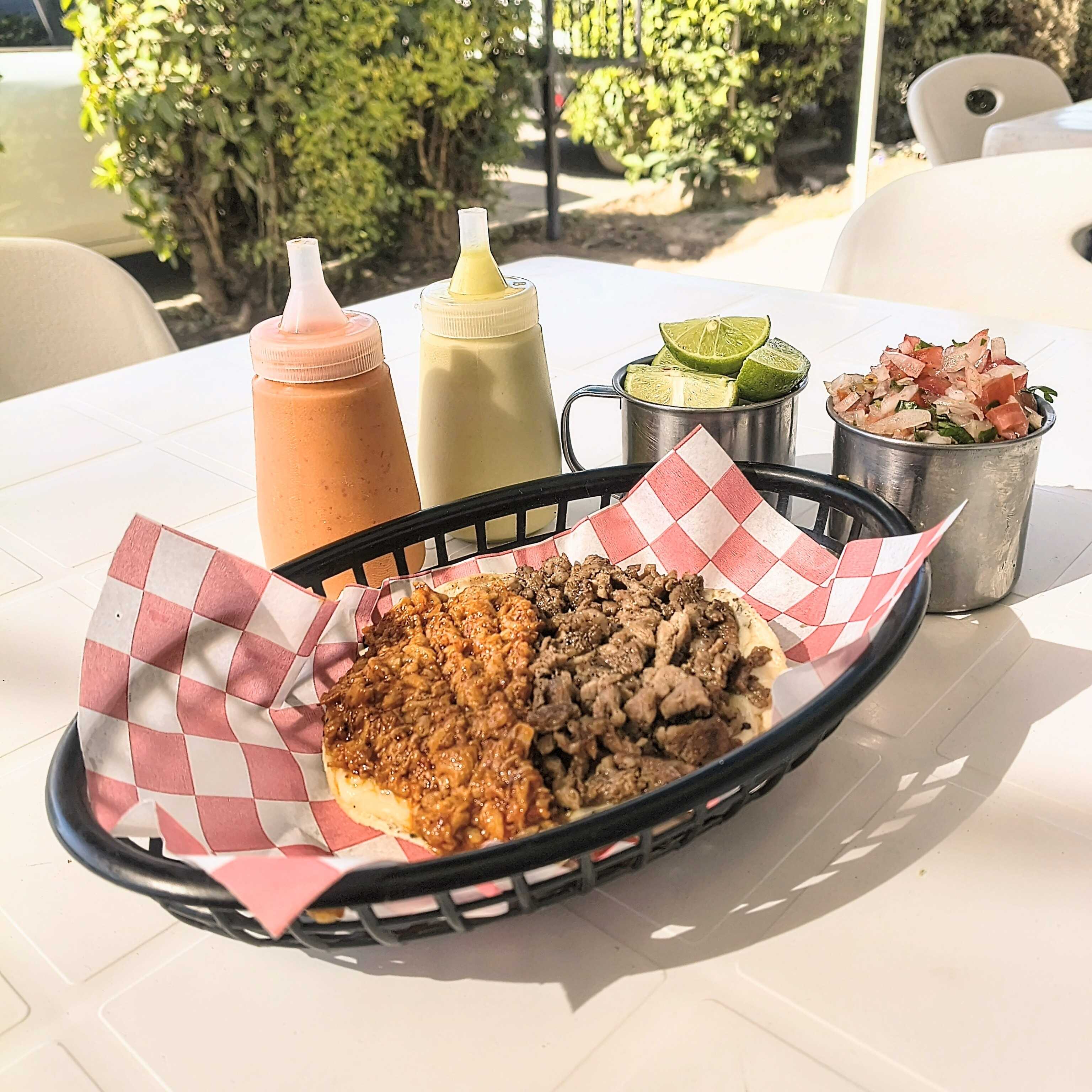 Kit de 2 tacos grandes: 1 de carne asada y 1 de carne asada con longaniza en tortilla de harina hecha a mano. Acompañados de pico de gallo, limones y 2 salsas de la casa.