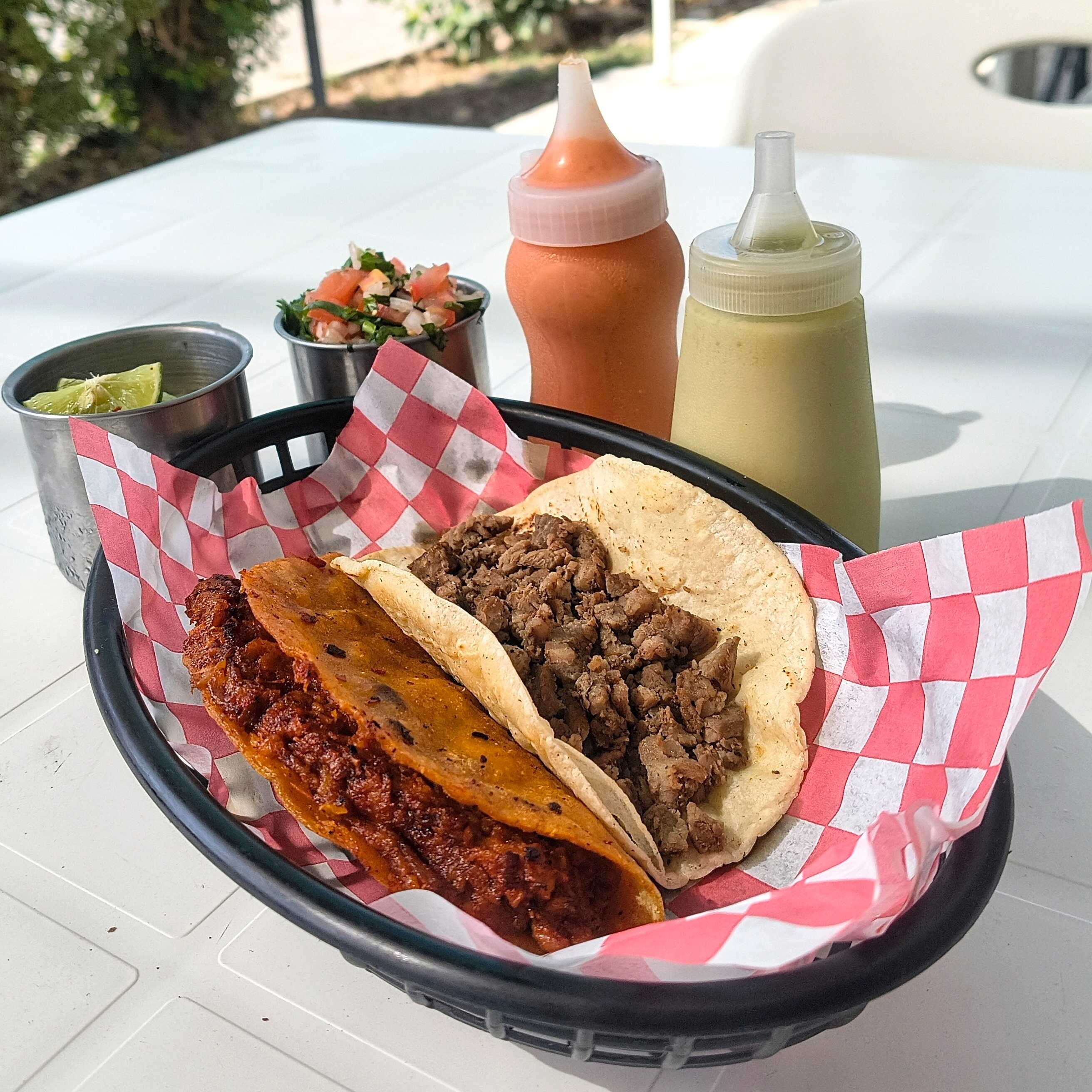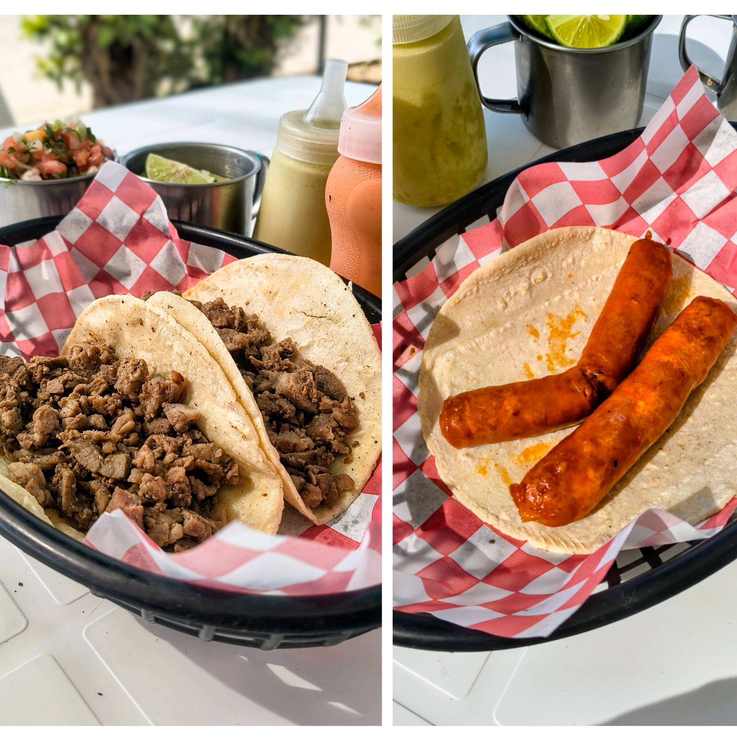 Orden de 4 tacos: 2 de carne asada y 2 de chistorra tortilla de maiz. Acompañados de pico de gallo, limón y 2 salsas de la casa.