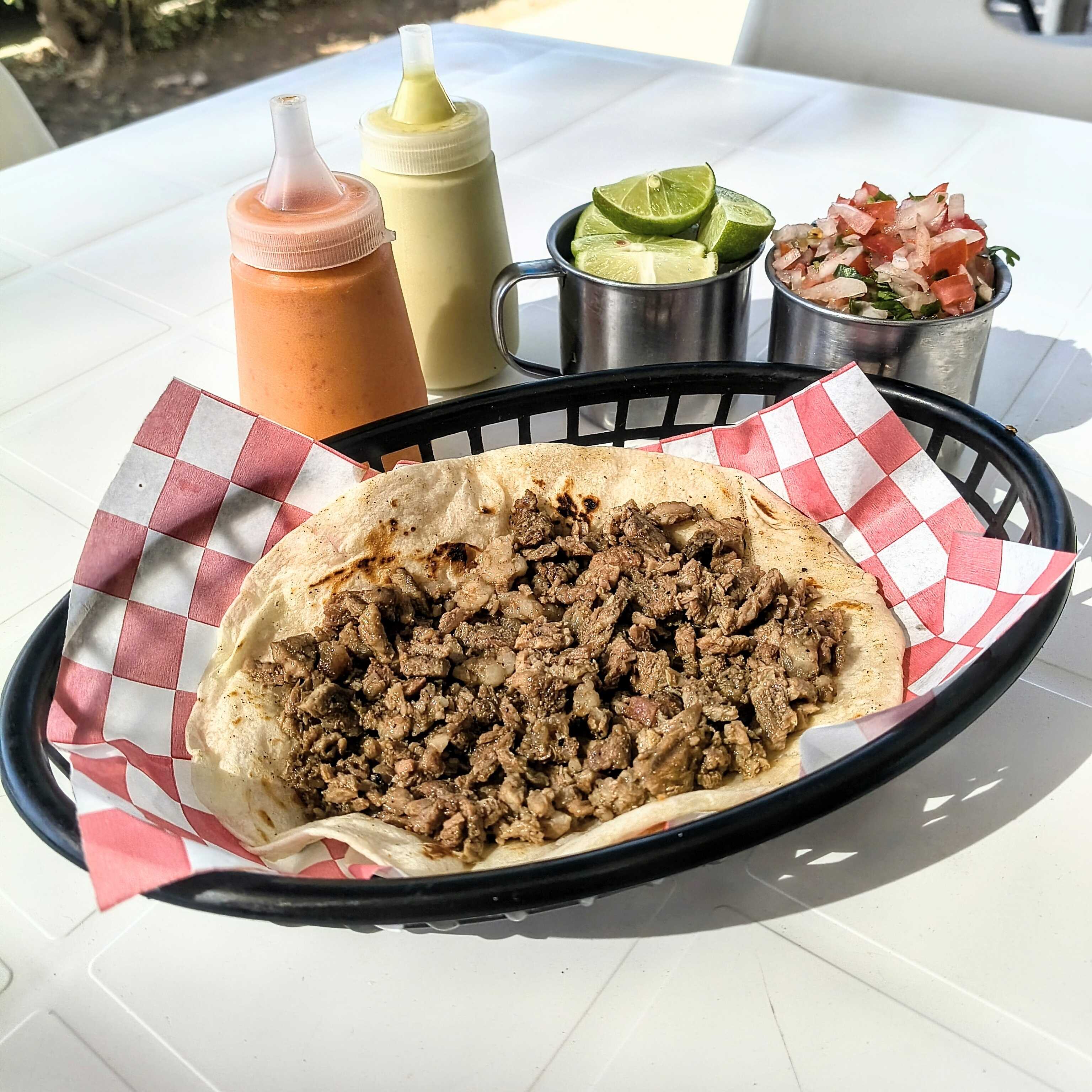 taco de carne asada en tortilla de maiz acompañado de pico gallo, limones y salsas de la casa