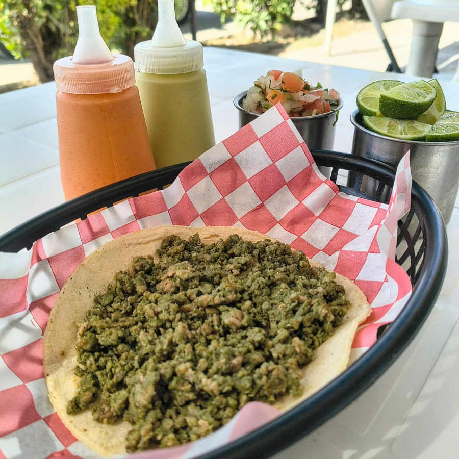 Taco de carne chistorra en tortilla de maiz acompañado de pico de gallo limon y salsa de la casa. Los