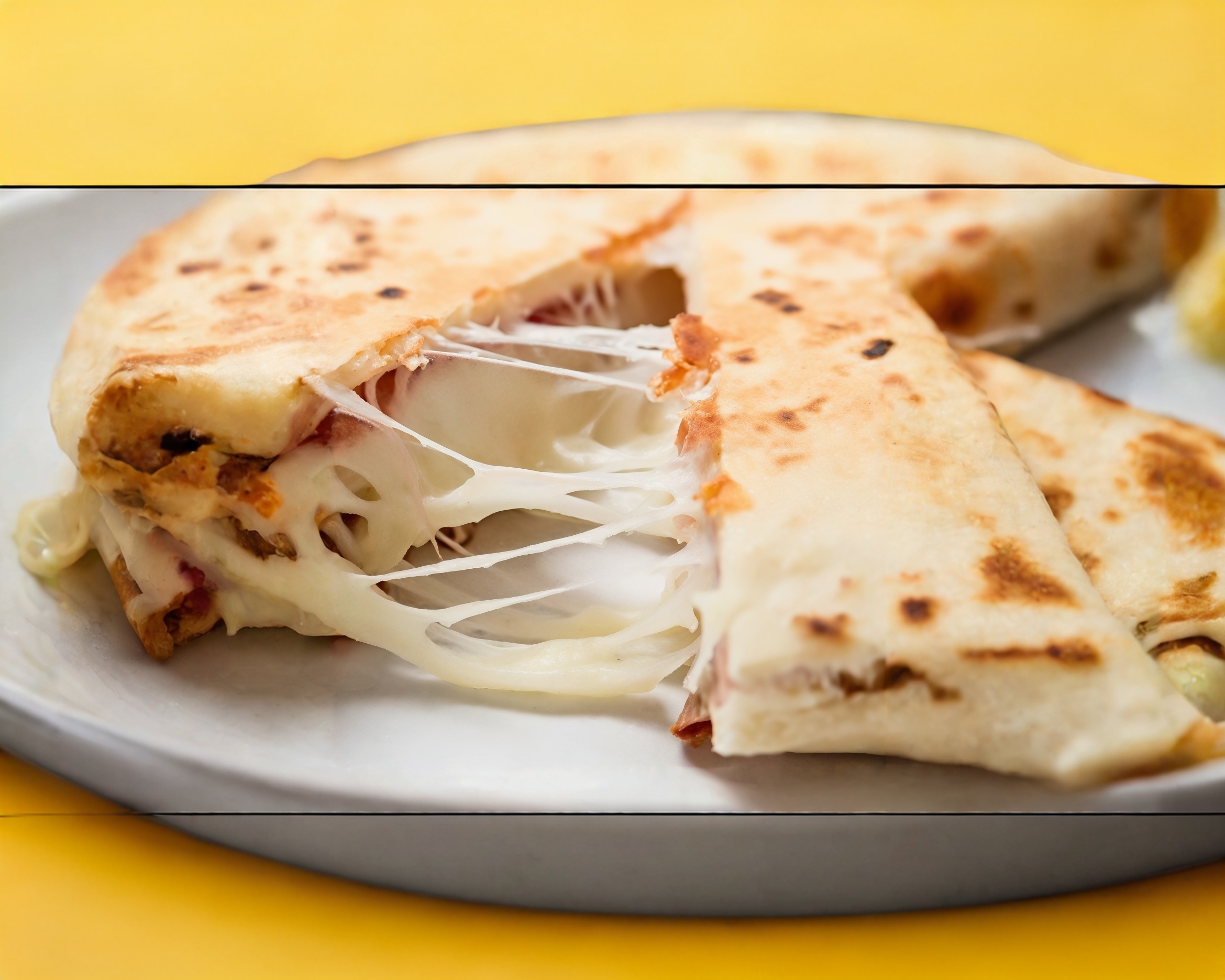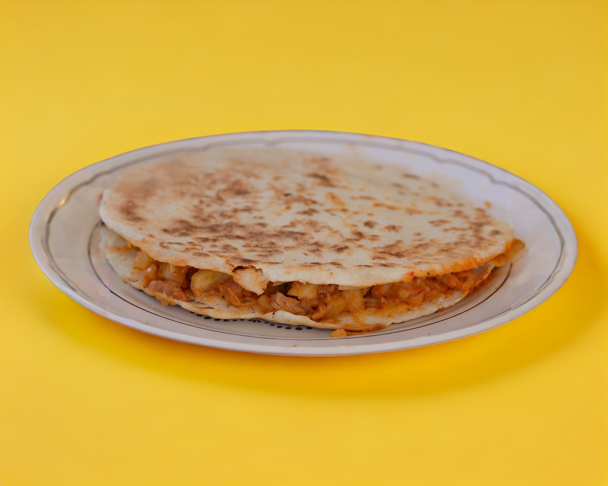 Dos tortillas de harina en forma de quesadilla, con guisado y queso