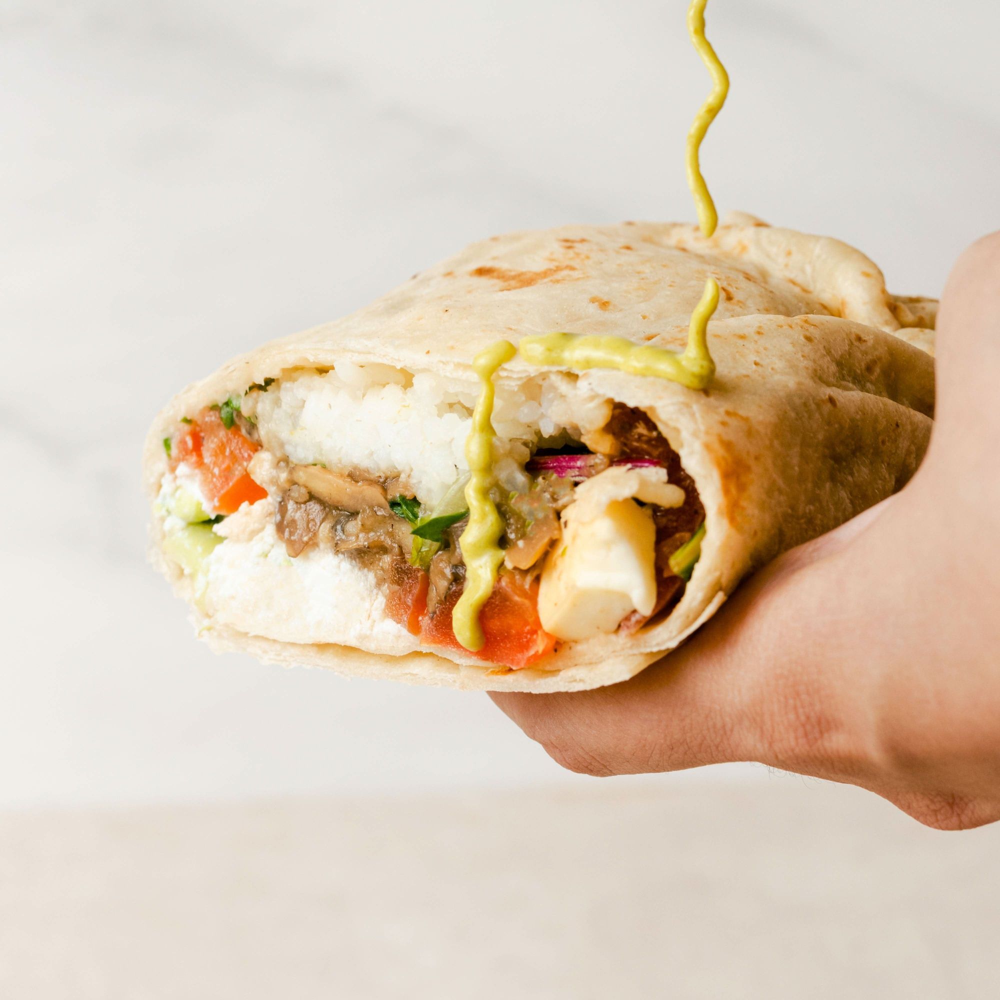 Bugo con pollo, base de arroz y frijoles negros, pico de gallo, elote preparado, queso manchego y spicy mayo con aderezo de cilantro.