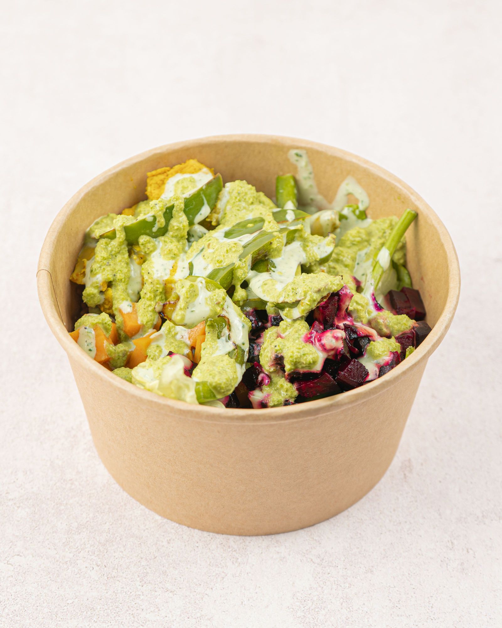 Un bogo muy especial, doble base de lechuga-espinaca, fideo seco, pollo, camote, betabel, pimiento asado, salsa cilantro y jalapeño