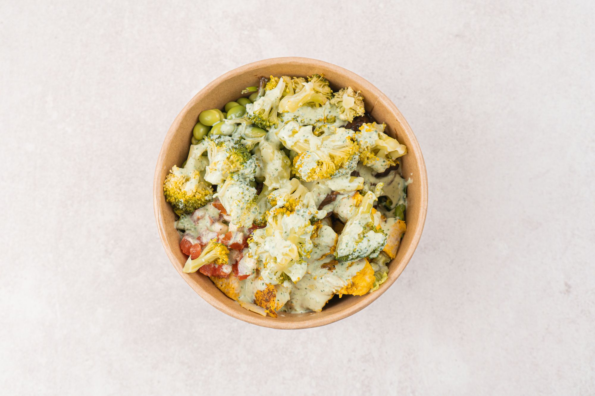 Triple base de lechuga-espinaca, pollo, champiñon, tomate panela, brocoli, edamames, aceite de oliva y salsa cilantro.