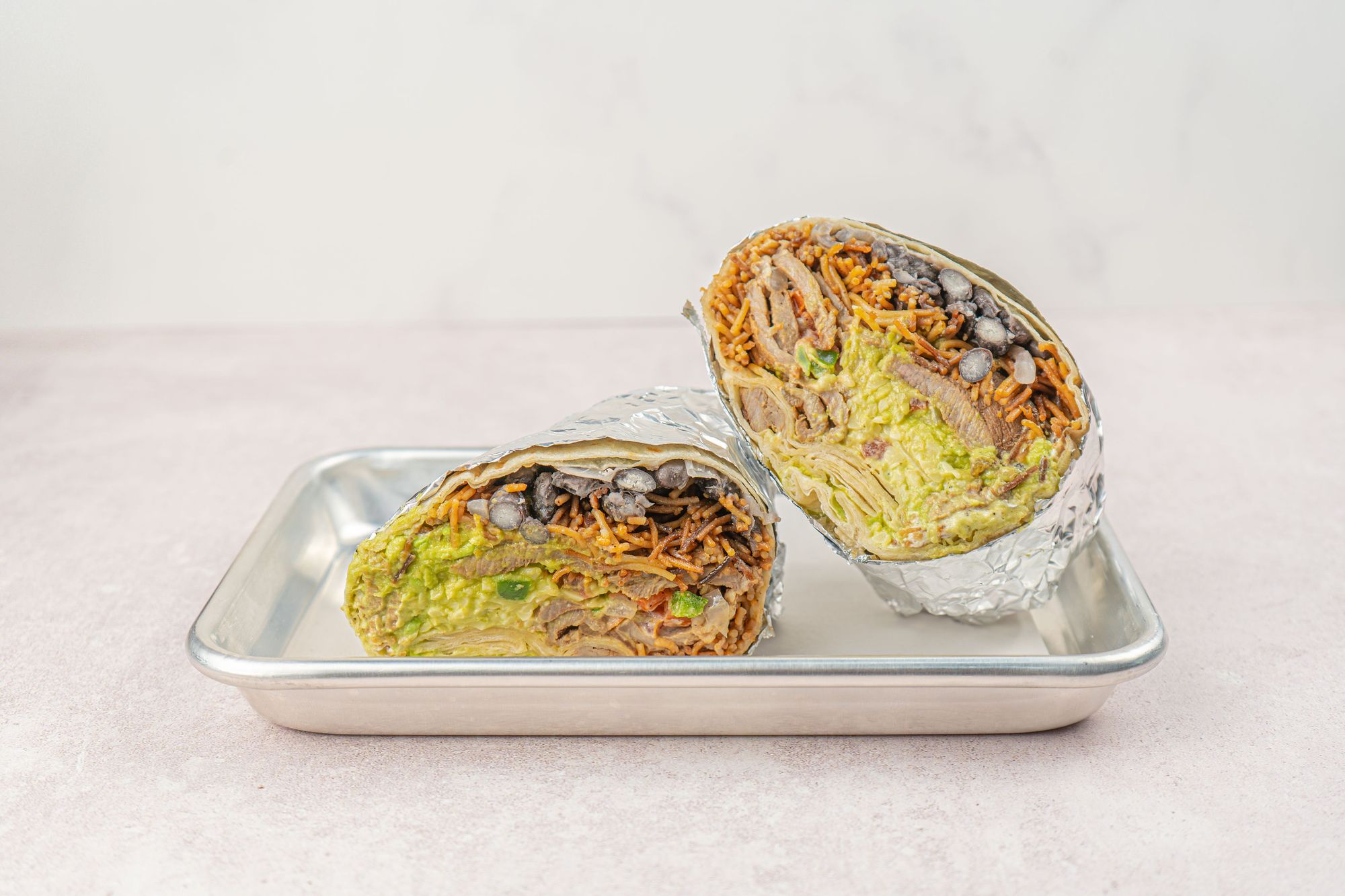 Bugo con carne, base de fideo seco y frijoles negros, pico de gallo, queso manchego, guacamole, crema y salsa de jalapeño.
