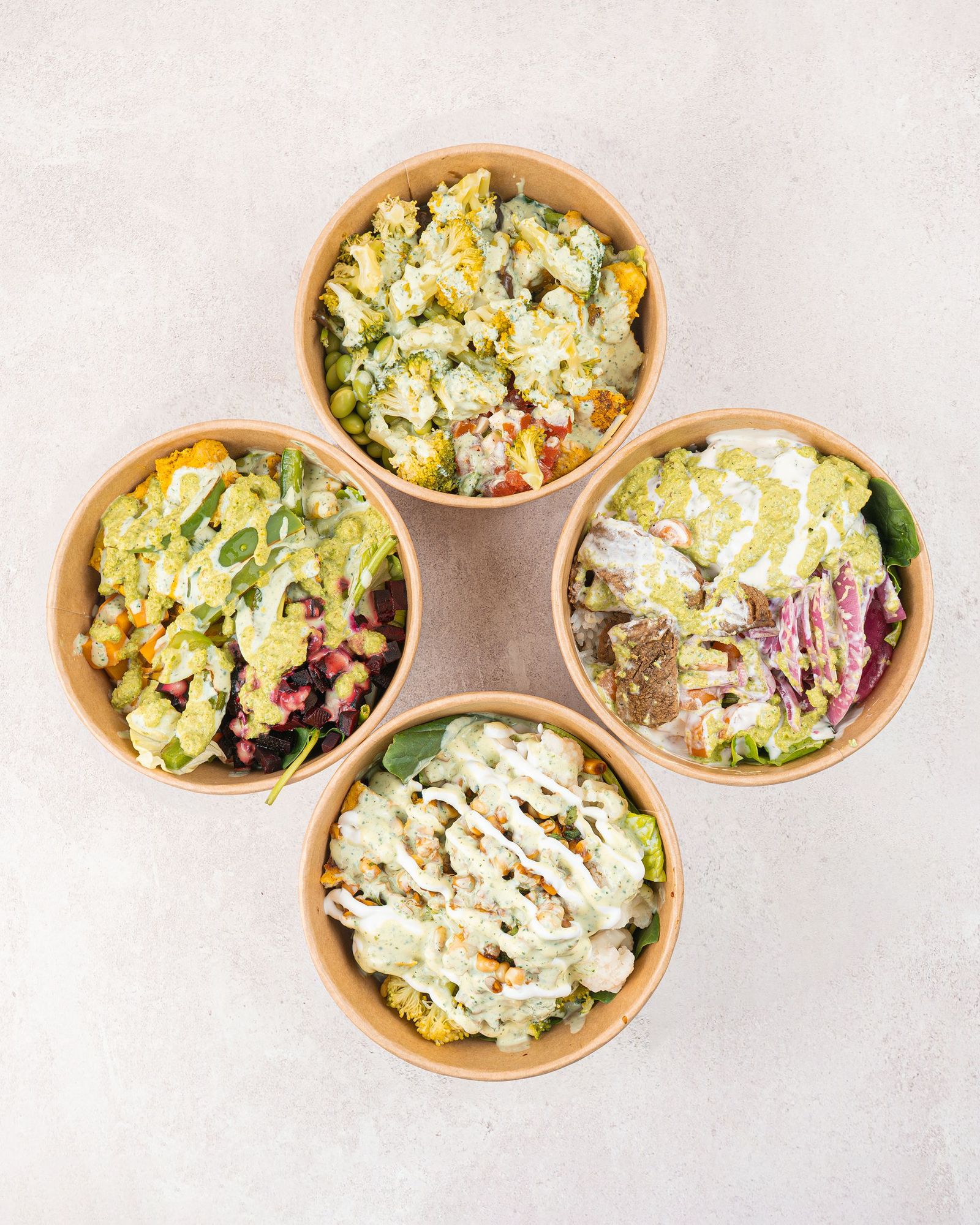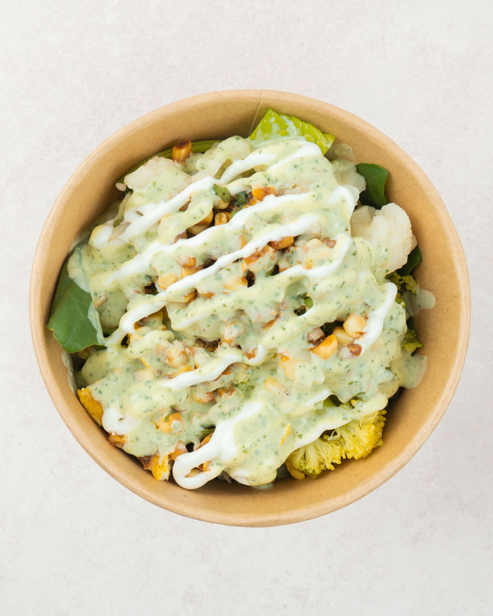 Bogo con pollo, base doble de arroz y lechuga-espinaca, brócoli, coliflor, elote, crema y aderezo de cilantro.