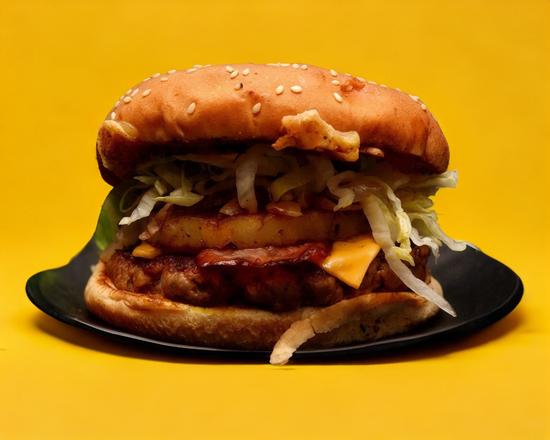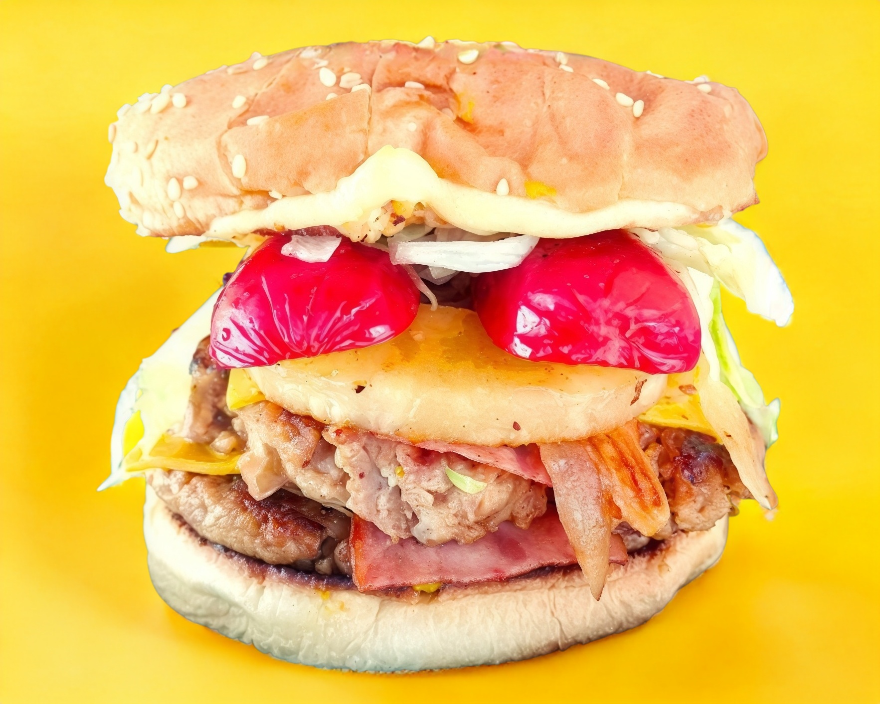 Doble carne de sirlon 130 gr, queso amarillo, tocino, queso mozarela en la tapa, piña, salchicha para asar, aguacate, cebolla, lechuga, tomate y chile