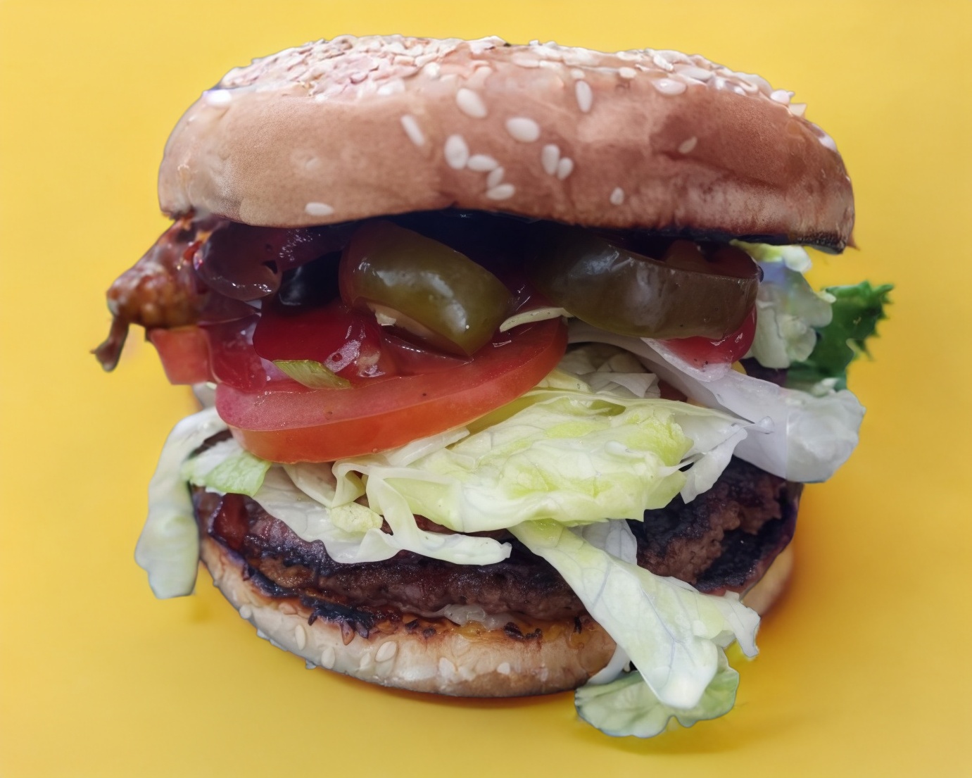Carne de sirlon 130 gr, queso amarillo, tocino, cebolla, lechuga, tomate y chile