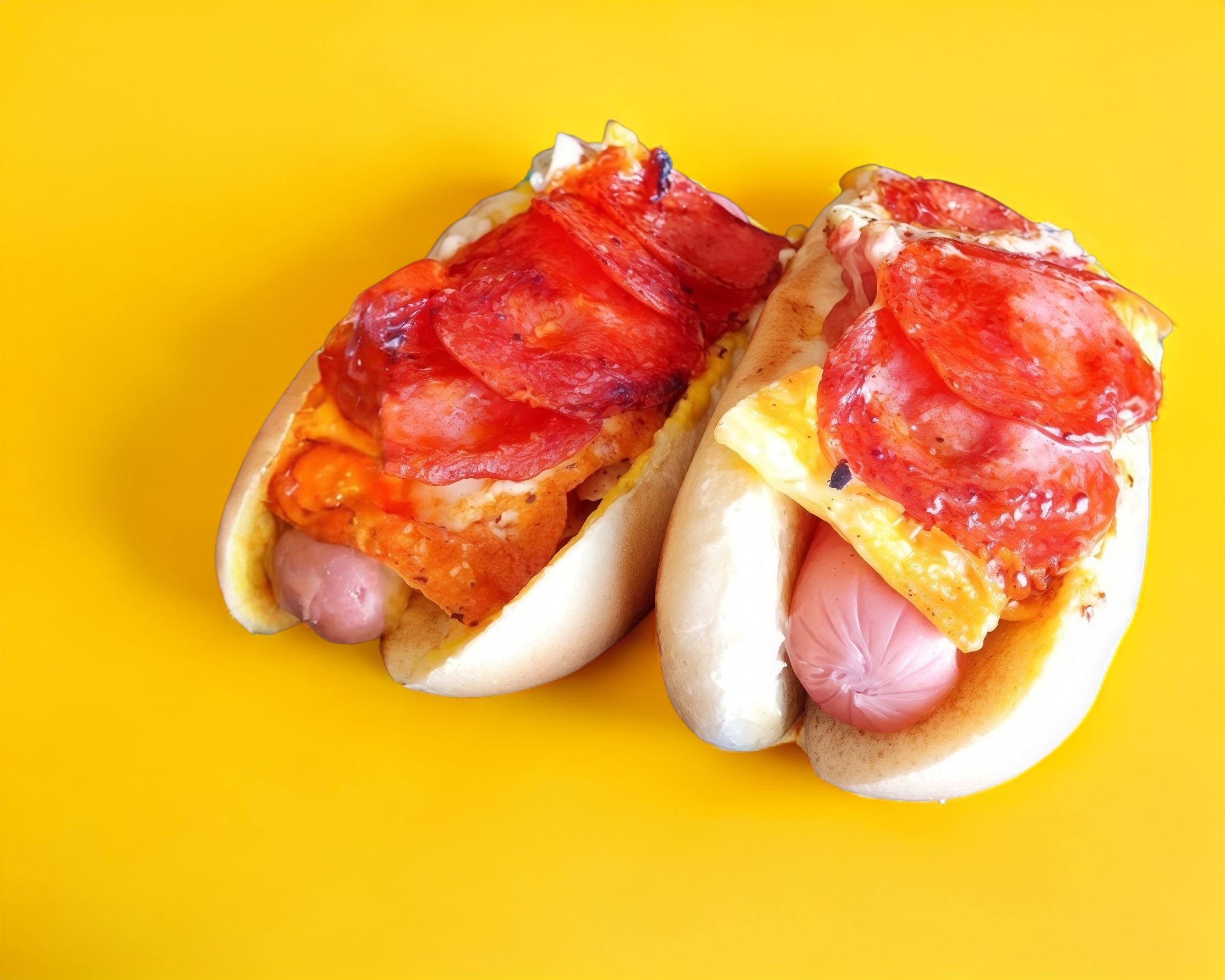 Pan con mayonesa, mostaza, salchicha Frankfurt, cebolla con tocino, cátsup, pepperoni, salsa de tomate y queso blanco