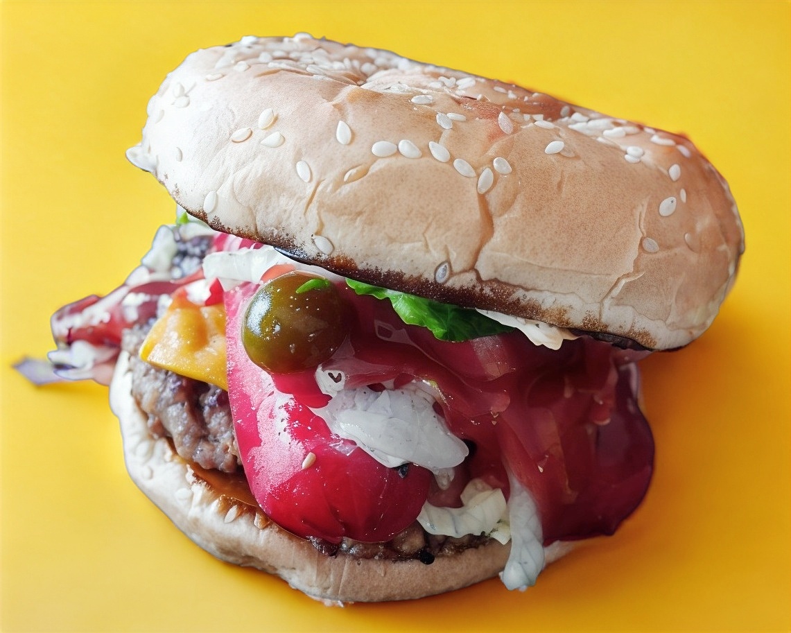 Carne de sirlon 130 gr, queso amarillo, tocino, queso mozarela en la tapa, aguacate, cebolla, lechuga, tomate y chile
