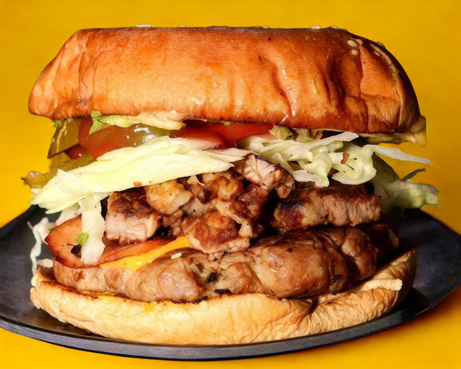 Doble carne de sirlon de 130gr cada una, queso amarillo, tocino, queso mozarela en la tapa, aguacate, cebolla, lechuga, tomate y chile