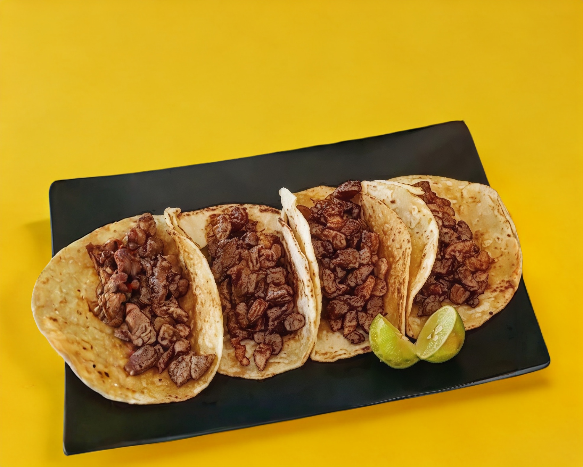 Sirloin a la plancha 350 gr, piña, cebolla caramelizada con tocino, tortilla de harina, lechuga, tomate, limon y salsas.