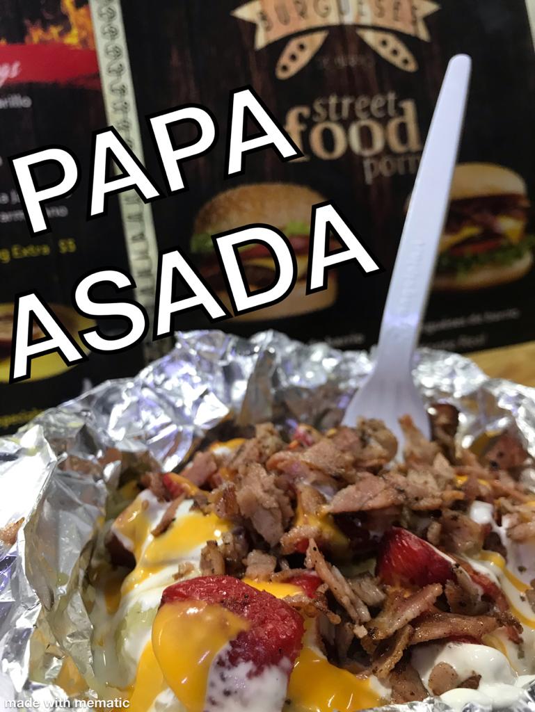 Papa asada con mantequilla queso chihuahua queso amarillo,crema y jugosa carne asada,,,acompañada de cebolla amarilla limón y salsa