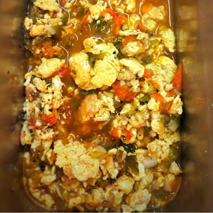 Chicharrón de pella en salsa verde con frijoles acompañado de chiles toreados y salsa de suero.