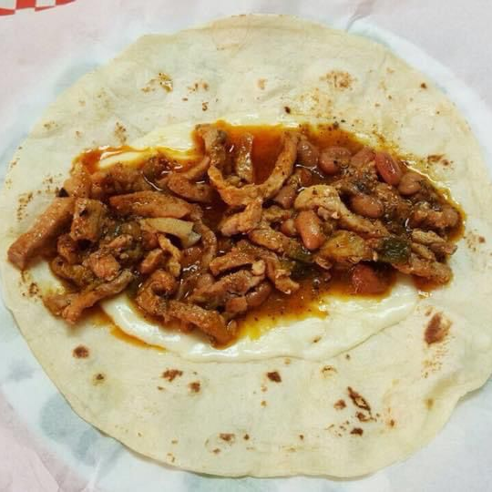 Quesadilla con queso asadero y fajitas de carne de puerco con frijoles en salsa roja, acompañado de chiles toreados y salsa de suero.