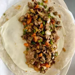 Fajitas de carne de puerco con frijoles en salsa roja, acompañado de chiles toreados y salsa de suero.