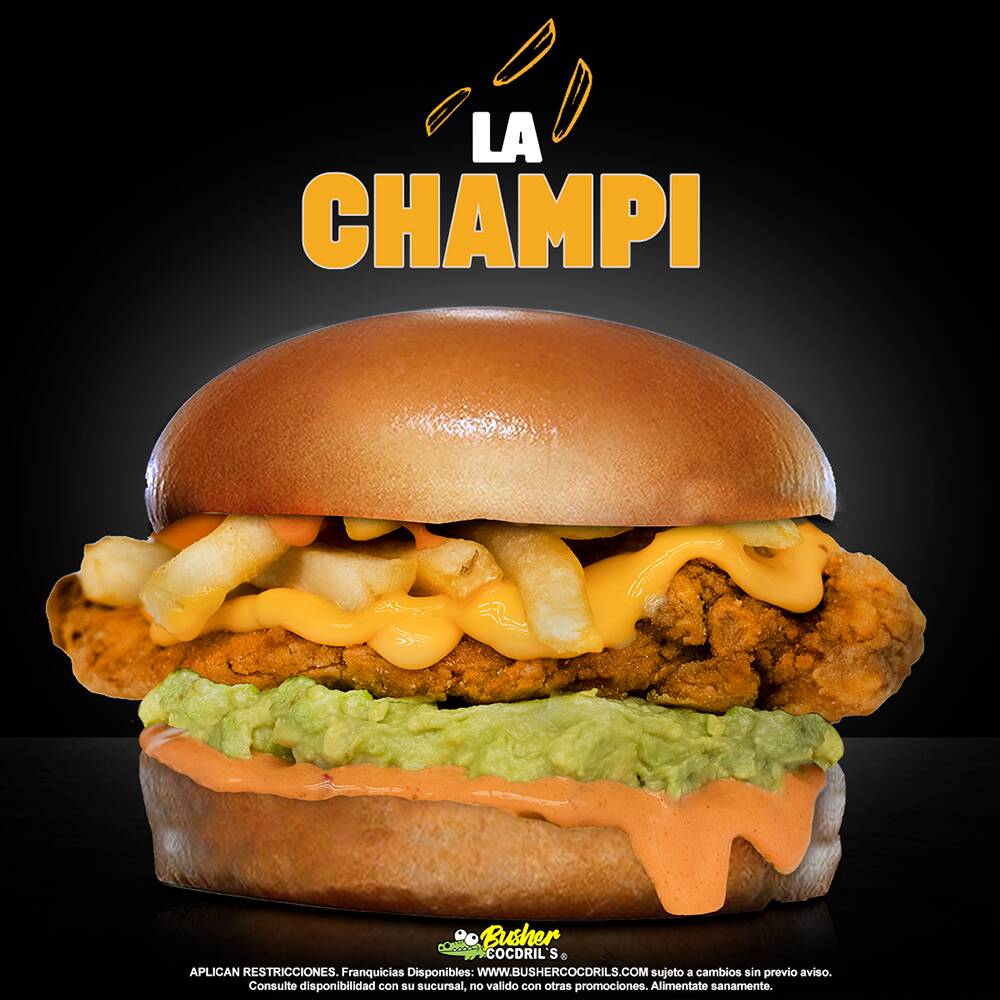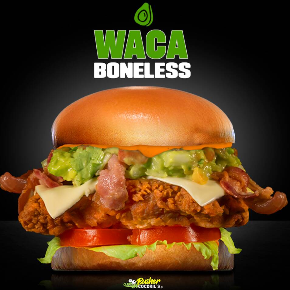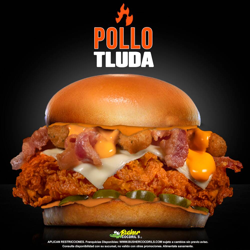 PECHUGA DE POLLO EMPANIZADA, ADEREZO SPICY DIP MONSTA, LECHUGA, TOMATE, GUACAMOLE, QUESO MANCHEGO Y TOCINO.