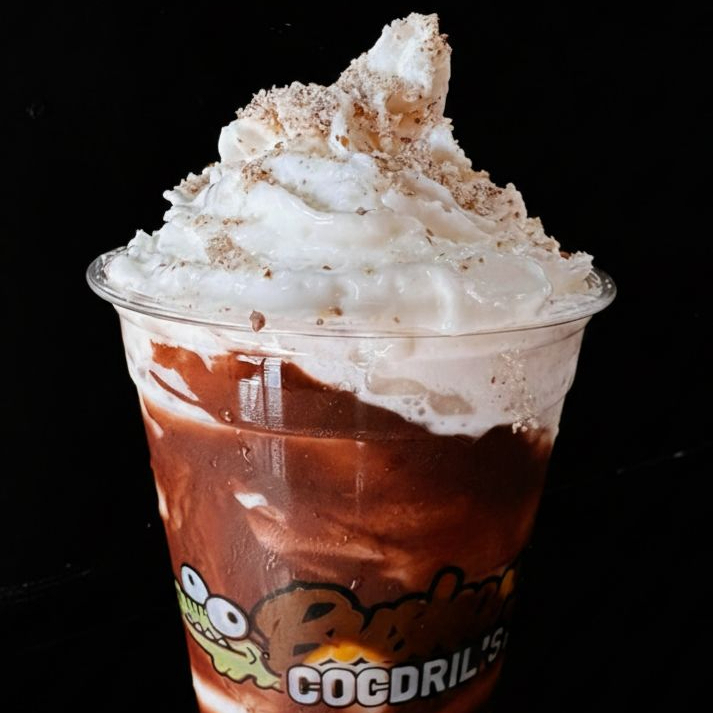base de leche con helado de chocolate y crema batida.