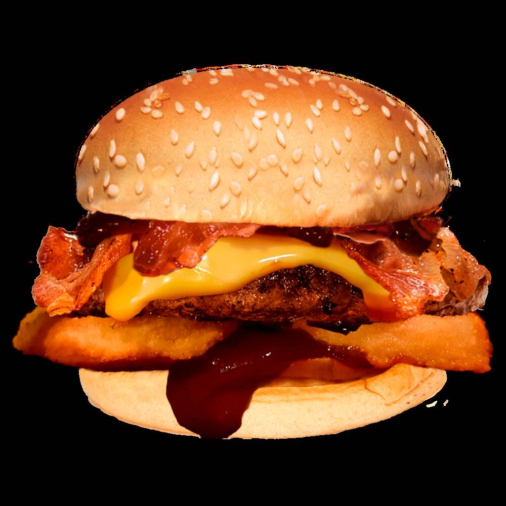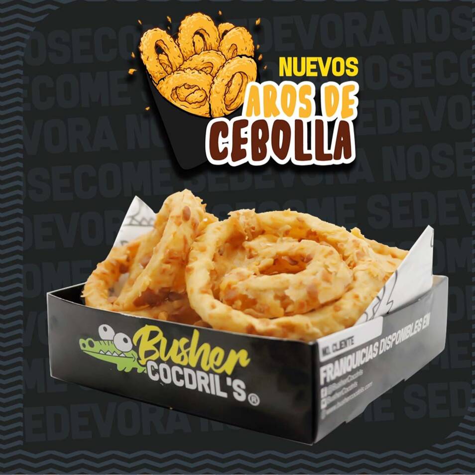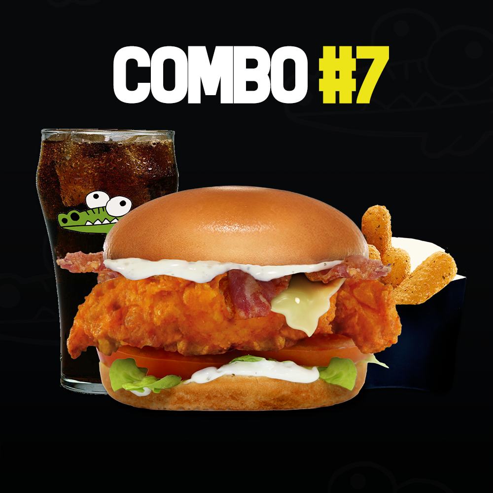 PECHUGA DE POLLO EMPANIZADA, HONEY SAUCE HOT BBQ, CHEESE DIP, TOCINO Y AROS DE CEBOLLA.
