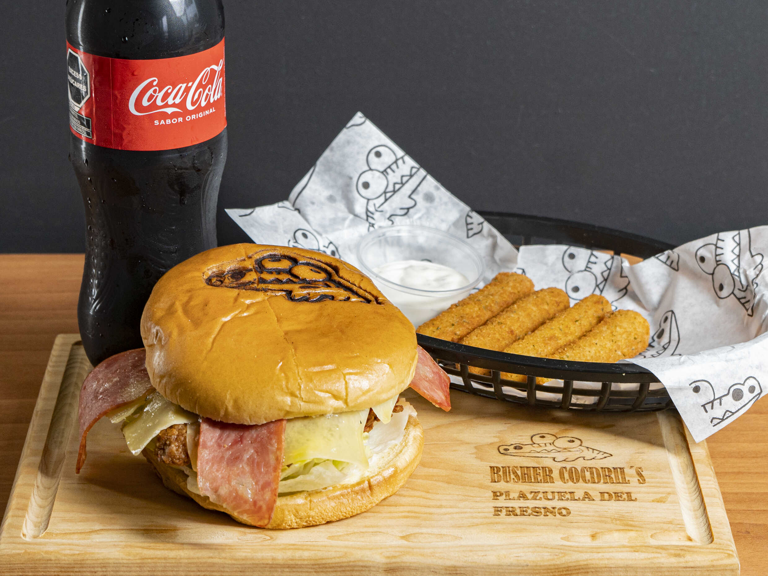 Hamburguesa a elegir, 4 pzas de dedos de queso y refresco.