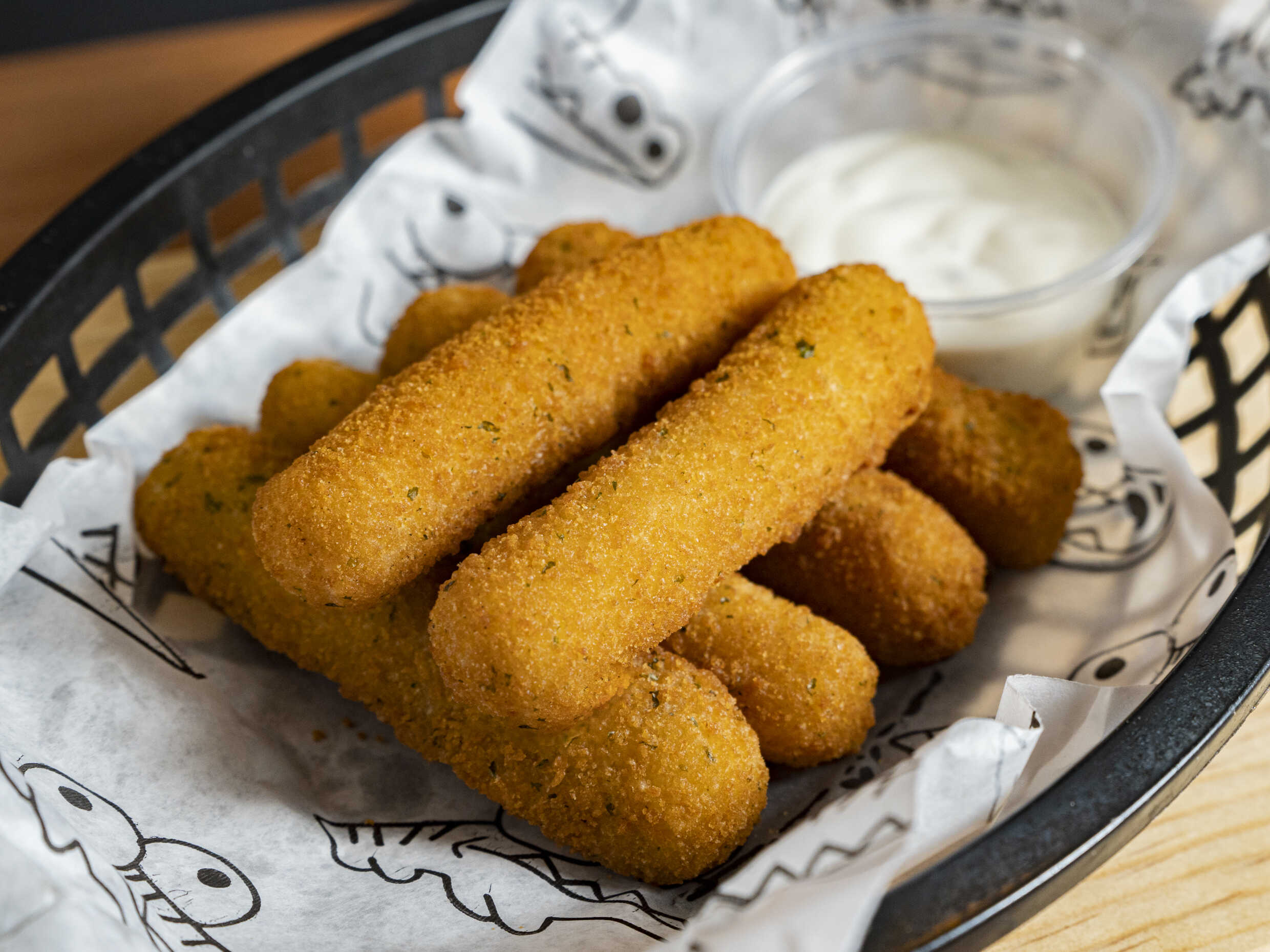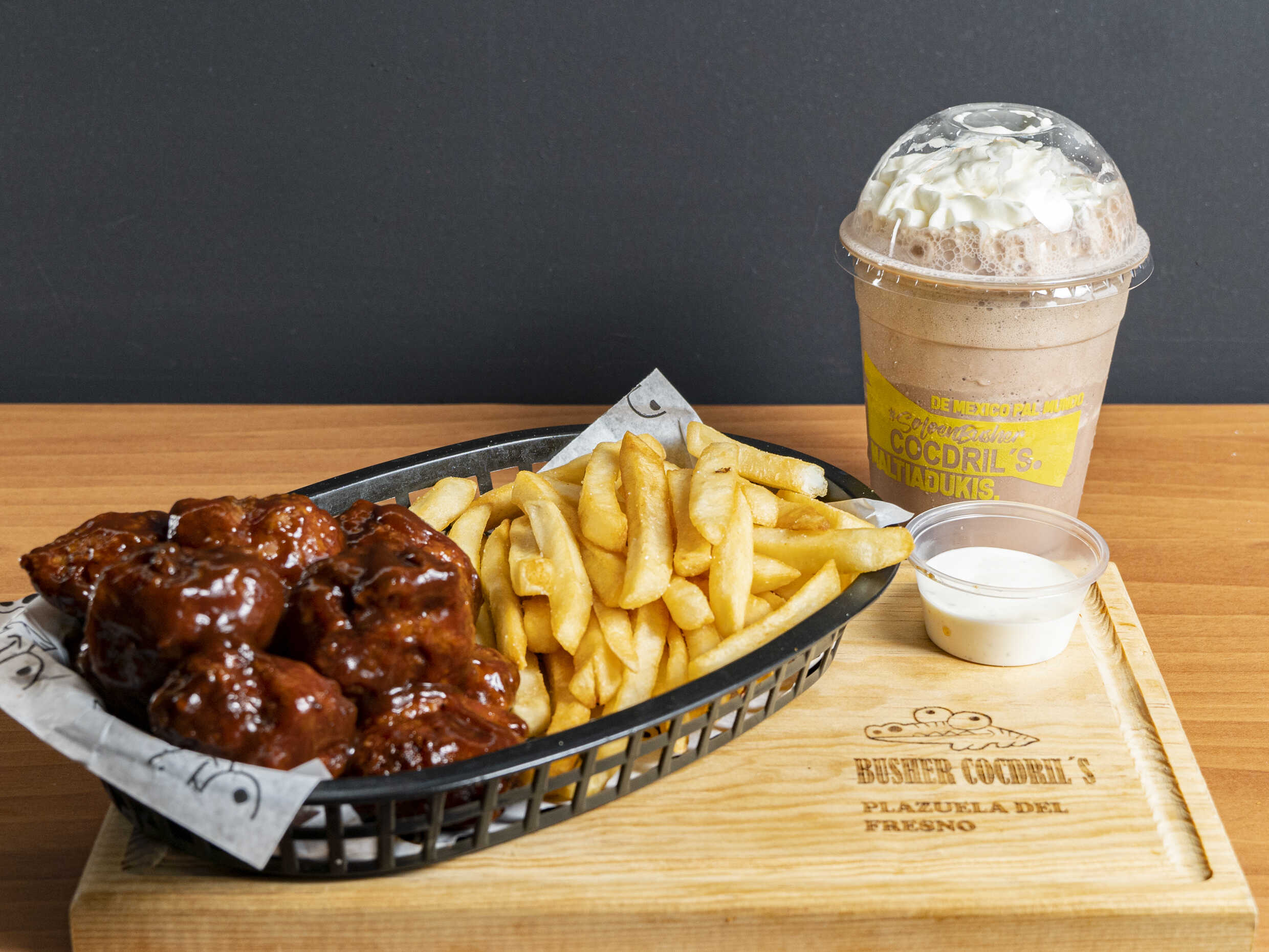 Papas a la francesa, sazonador a elección, boneless, salsa búffalo, bacon bits y blue cheese.