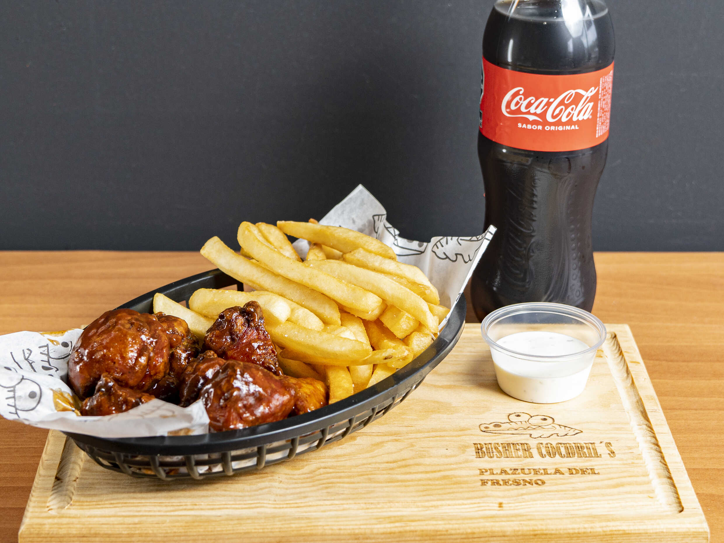 Medio kg de boneless, papas chicas de 150 g y 1 refresco.