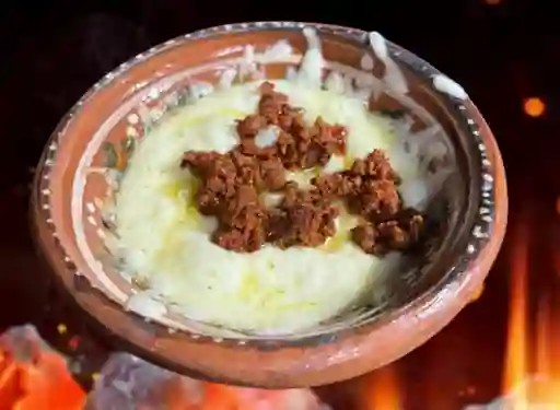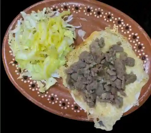 Tortilla de maíz en forma de canasta con frijoles refritos, aguacate, carne asada y queso.