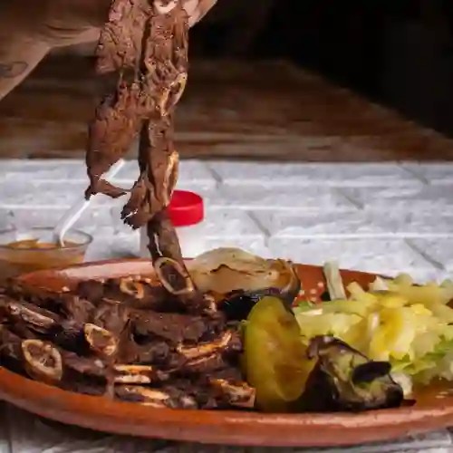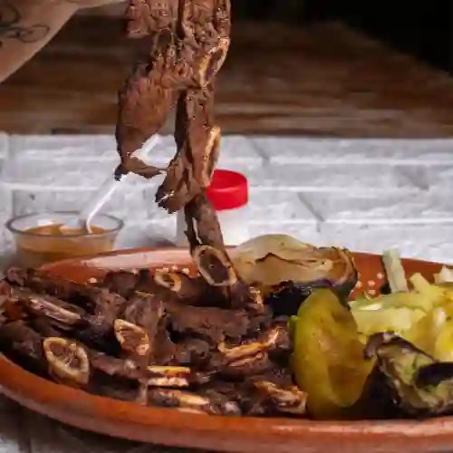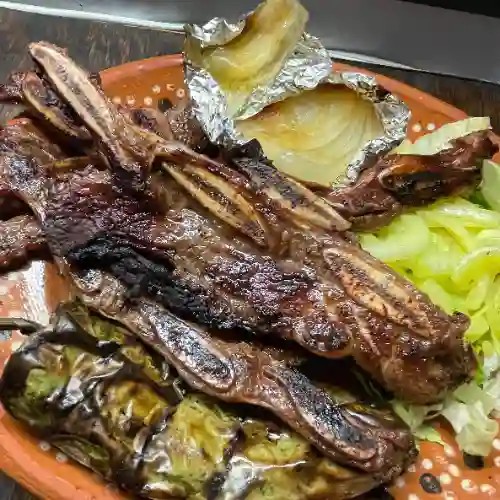 Costilla cargada 1/2 kg con cebolla asada, verdura chilaca de temporada y salsa de la casa.