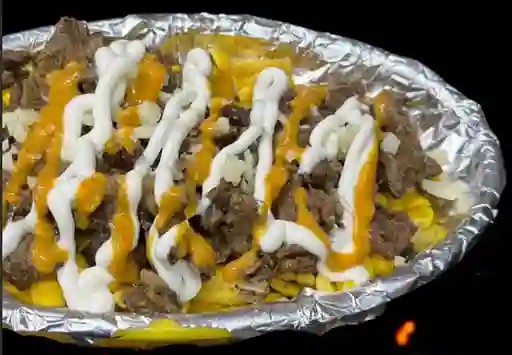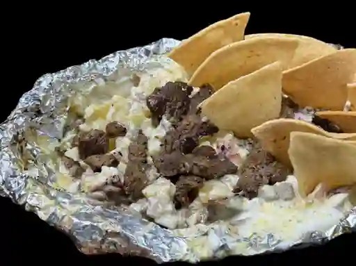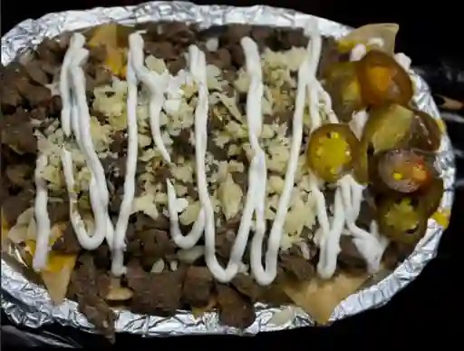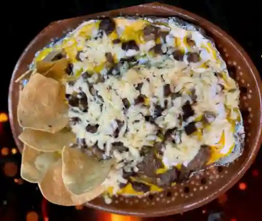 Totopos con queso amarillo, queso chihuahua, carne asada, crema y chile jalapeño.
