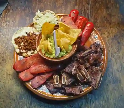 Costilla 200 g con 3 salchichas, 1 bomba de chorizo, 1 canasta de queso y guacamole.