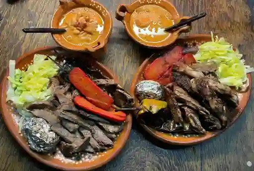 Paquete con costilla 300 g, sirloin 300 g, 2 salchichas, 2 frijoles charros, 2 cebollas asadas, 2 chilacas, verdura de temporada, salsa de la casa y porción de tortillas de maíz.