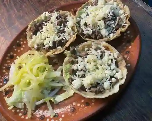 3 Tortillas de maíz en forma de canasta con frijoles refritos, aguacate, carne asada y queso.