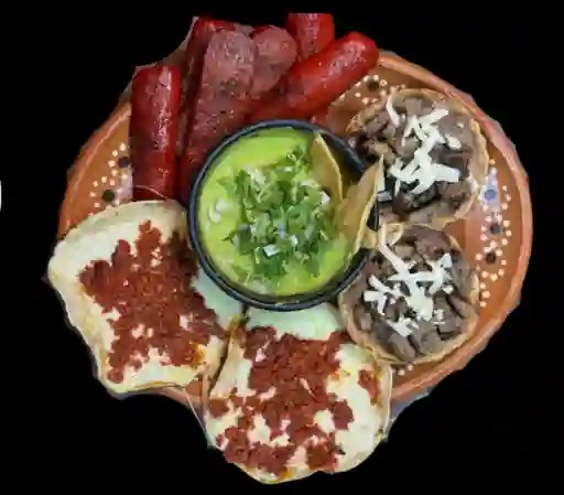 Plato con 2 canastas de queso, 3 salchichas, 2 bombas de chorizo, guacamole y totopos.