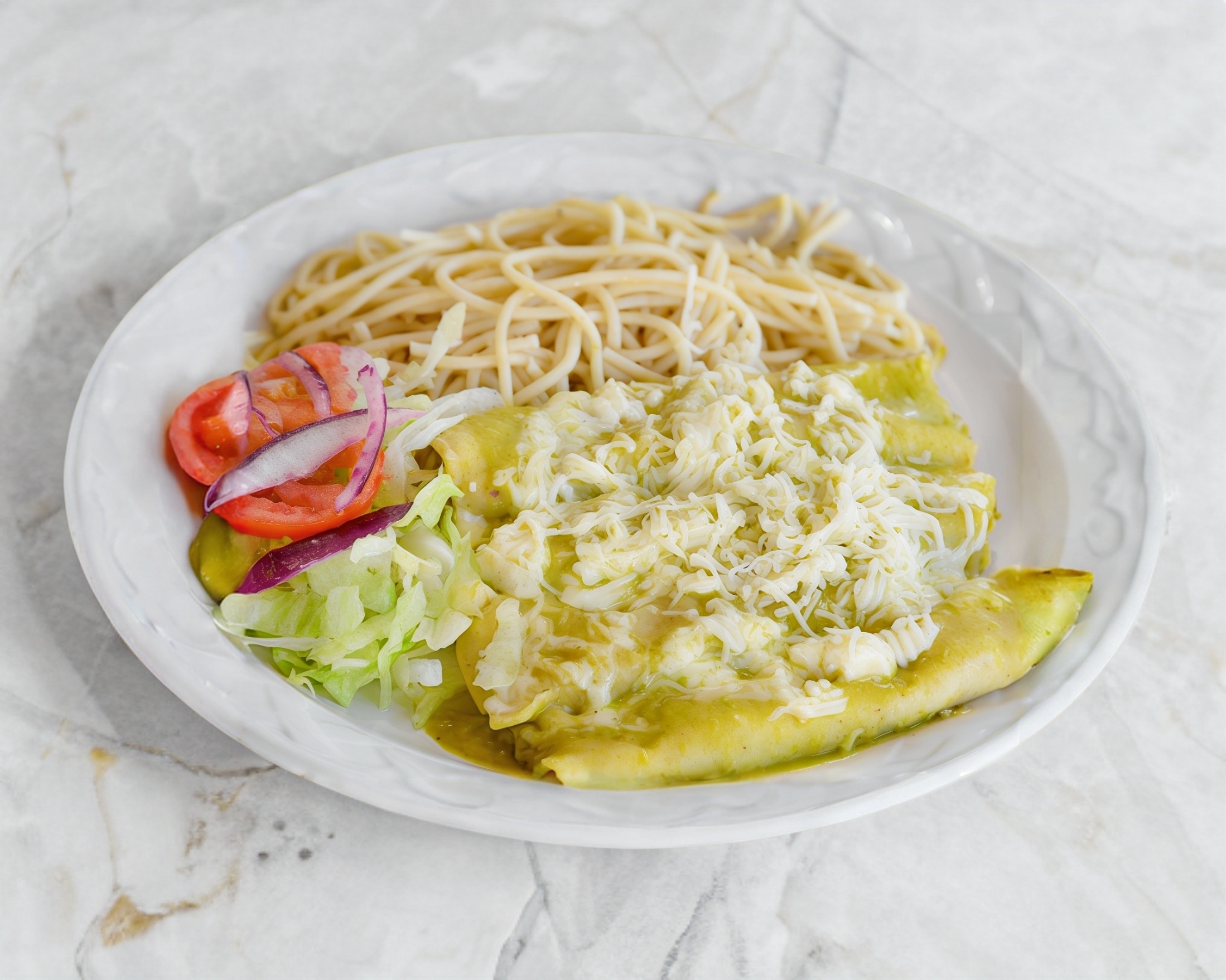 Enchiladas Verdes o Rojas, Incluye Arroz o Spaguetti, Lechuga