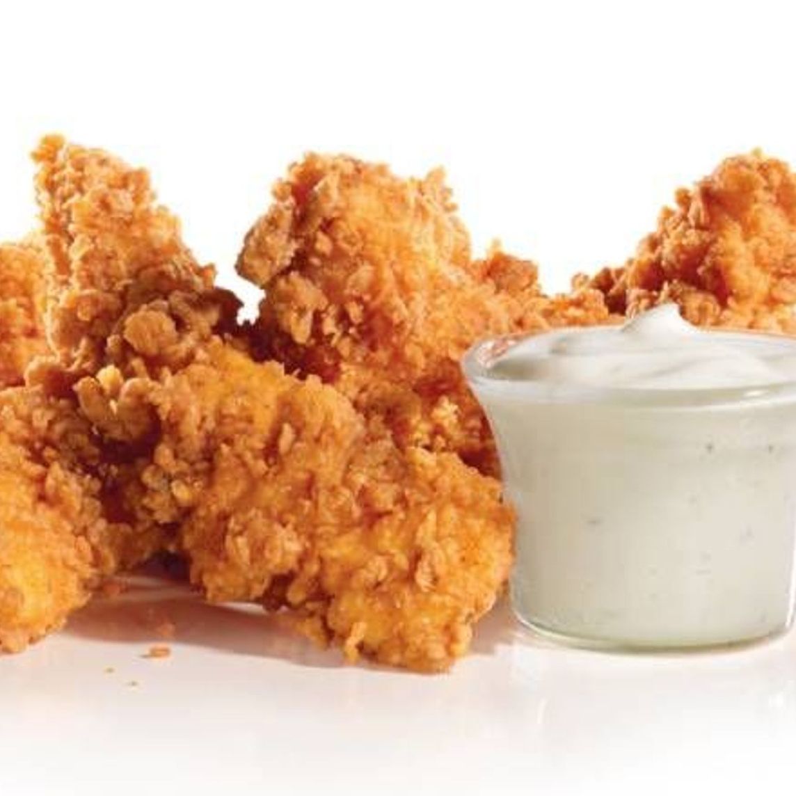 2 Tiras de Hand-Breaded Chicken Tenders, aderezo Buttermilk Ranch, lechuga y tomate en pan blanco.