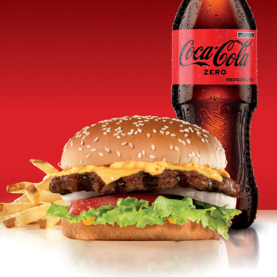 Con Carne 100% de res, queso Americano, lechuga, tomate, cebolla blanca y aderezo All-American. Servida en pan con ajonjolí. El combo incluye papas chicas (105 gr) y refresco (600 ml)