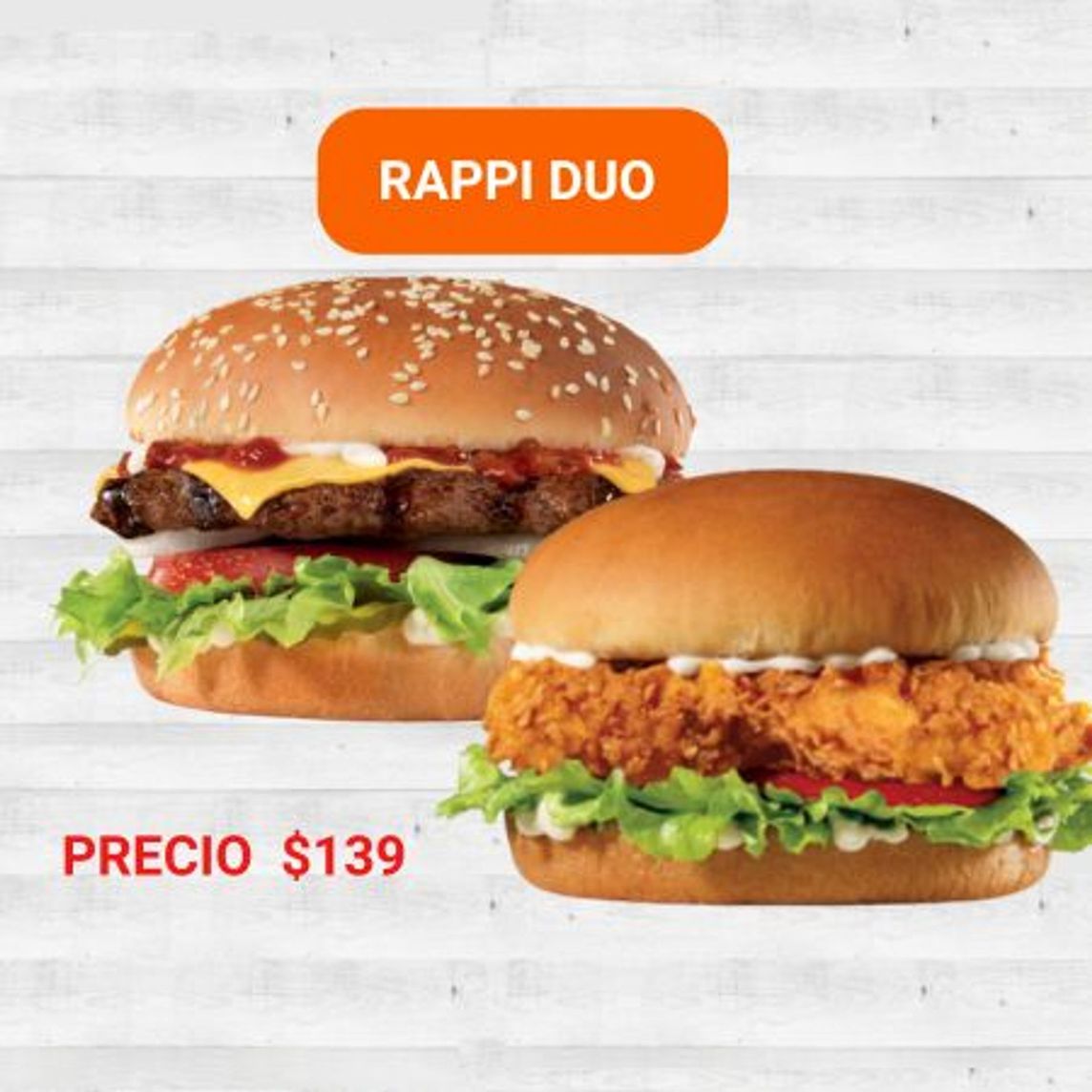 2 piezas de carne 100% de res asadas a la parrilla, nuestra salsa clásica, dos rebanadas de queso americano y lechuga.