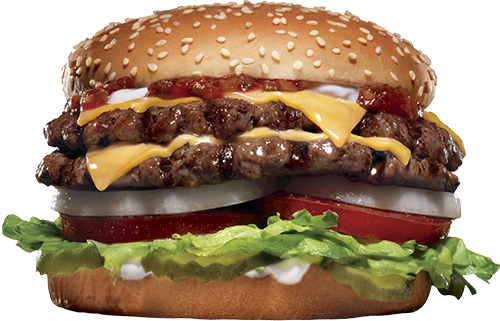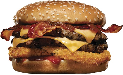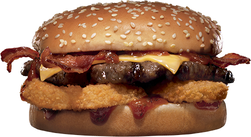 Hamburguesa con carne 100% de res, asada a la parrilla, salsa BBQ, 2 tiras de tocino, queso americano y aros de cebolla empanizados