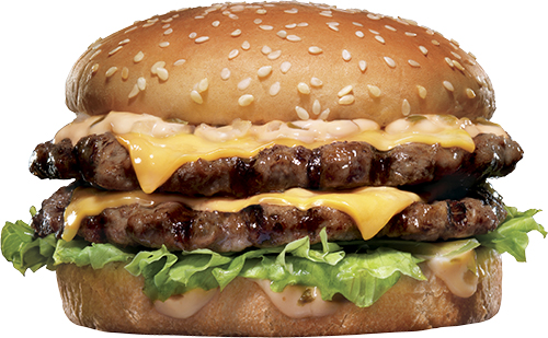 Hamburguesa con dos piezas de carne 100% de res ,dos rebanadas de queso americano, lechuga, tomate, pepinillos,mayonesa, salsa especial en pan con ajonjolí.