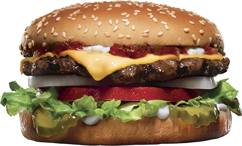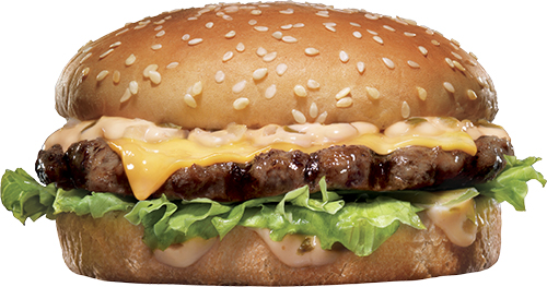 Dos piezas de carne 100% de res asadas a la parrilla, nuestra salsa clásica, dos rebanadas de queso americano y lechuga.