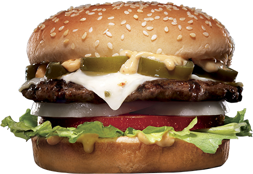 Hamburguesa con carne 100% de res, queso pepper jack, rodajas de chile jalapeño, lechuga, tomate, cebolla, salsa santa fe, en pan con ajonjolí
