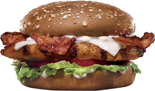 Pechuga de pollo asada a la parrilla , mayonesa, 2 tiras de tocino, queso estilo suizo, tomate y lechuga en pan integral