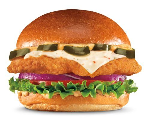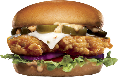 2 Tiras de pechuga de pollo empanizadas, aderezo santa fe, lechuga,tomate, cebolla morada,chiles jalapeños y queso pepper jack en pan sencillo sin ajonjolí