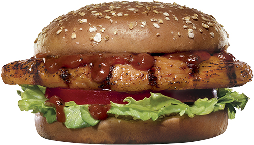 Sandwich con pechuga de pollo a la parrilla, lechuga, tomate, y salsa BBQ en pan integral.
